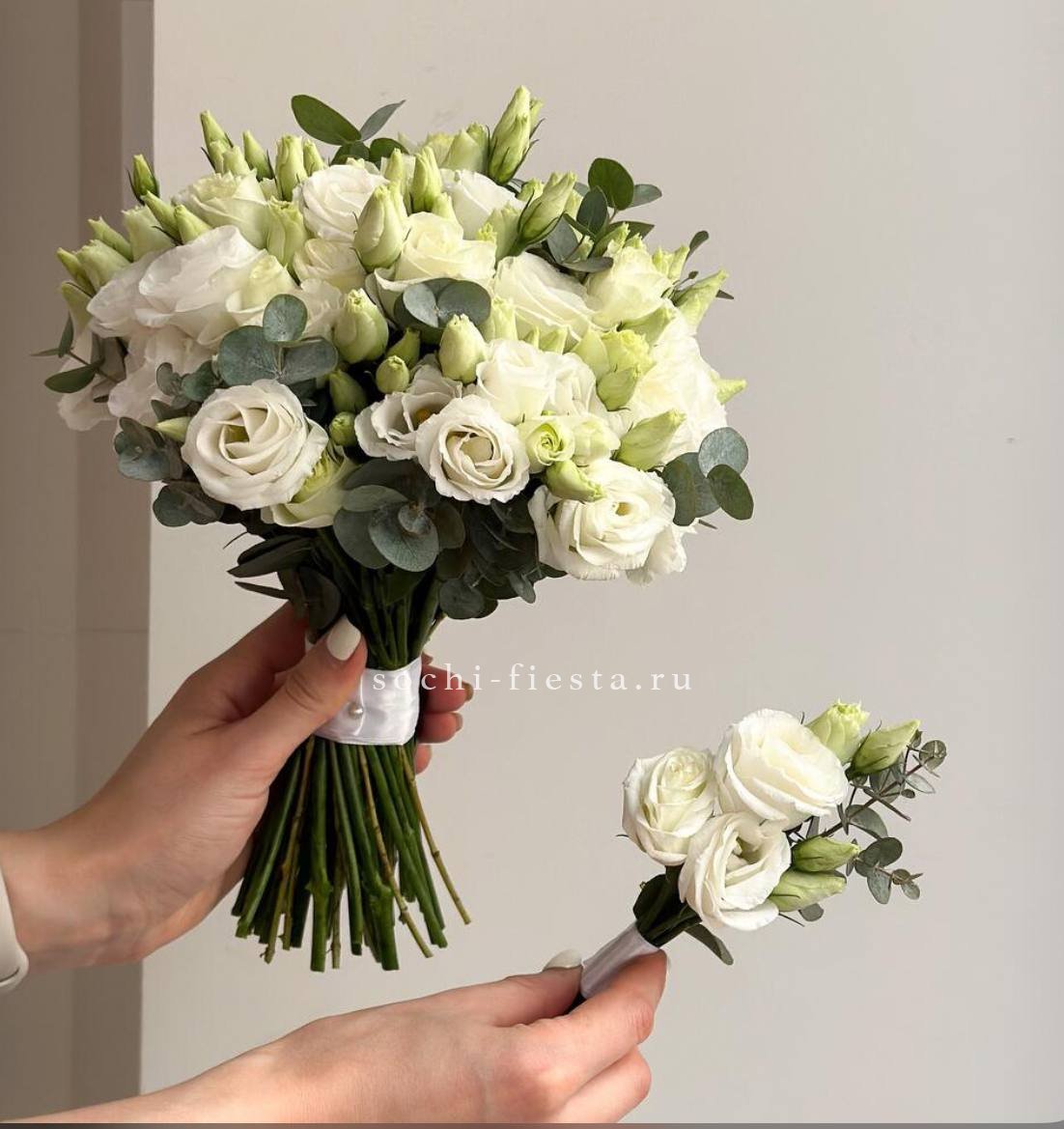 Девятнадцать бутонов эустомы раскрываются слоями воздушных лепестков создавая мягкую текстурную глубину. Эвкалипт добавляет свежести этому монохромному свадебному решению.