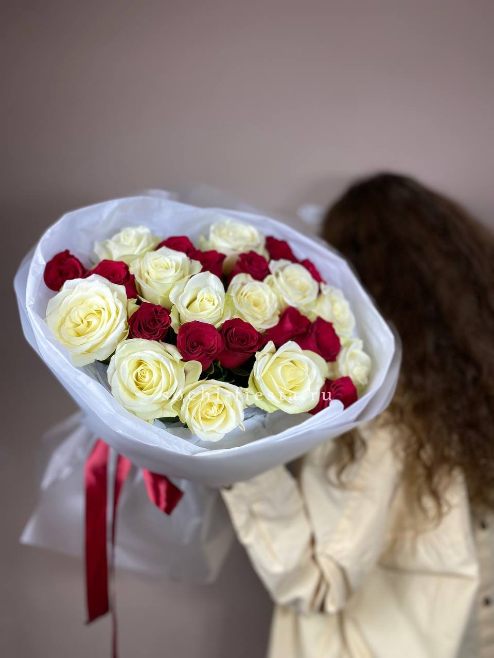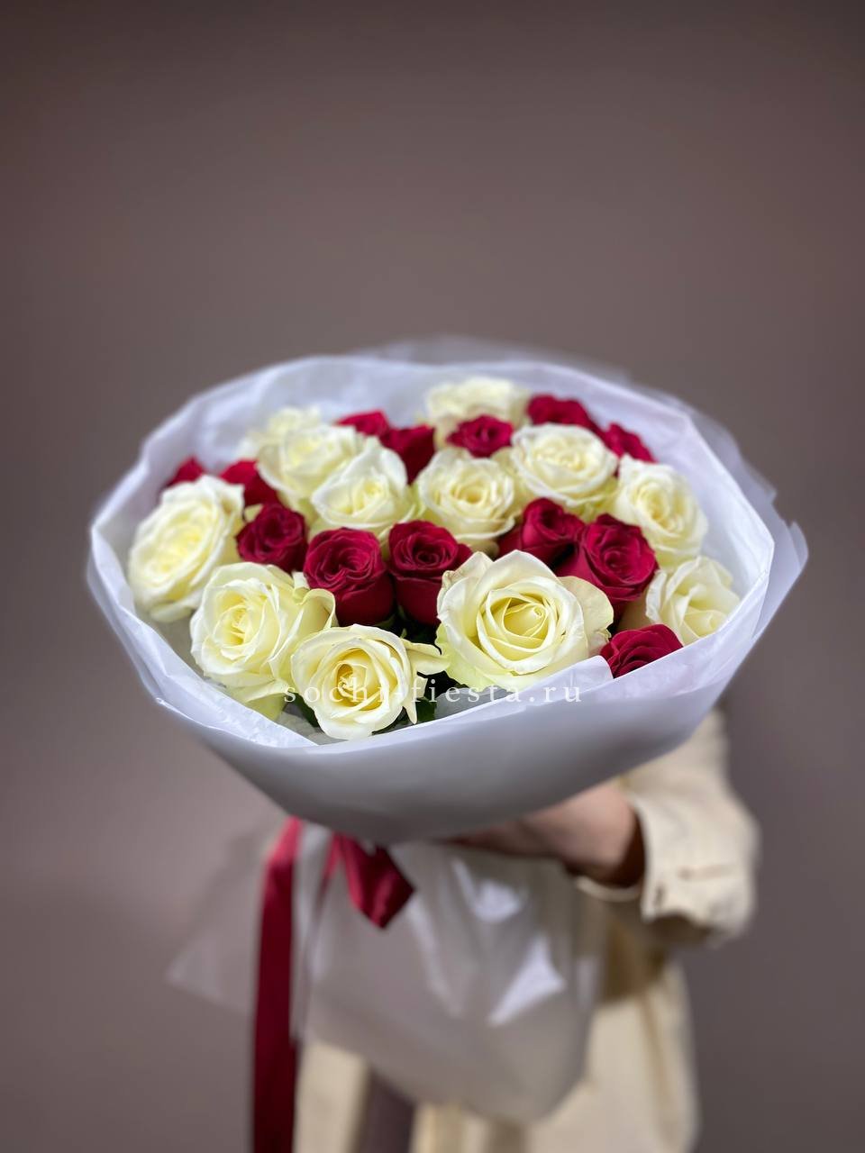 Розы Carousel радуют двухцветными лепестками с плавными переходами от кремового к малиновому краю. Пятнадцать бутонов собраны в аккуратную форму, которая долго сохраняет свежесть и яркость.