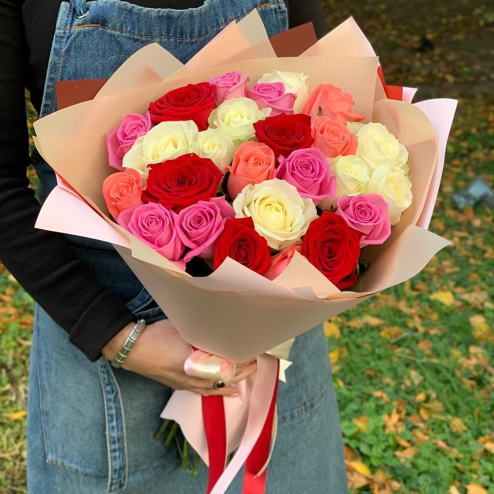 25 разноцветных роз, корейская пленка, лента.