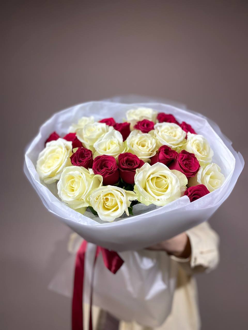 Для заказа товара "Букет их красных и белых 25 роз" с доставкой в Махачкале нажмите в корзину