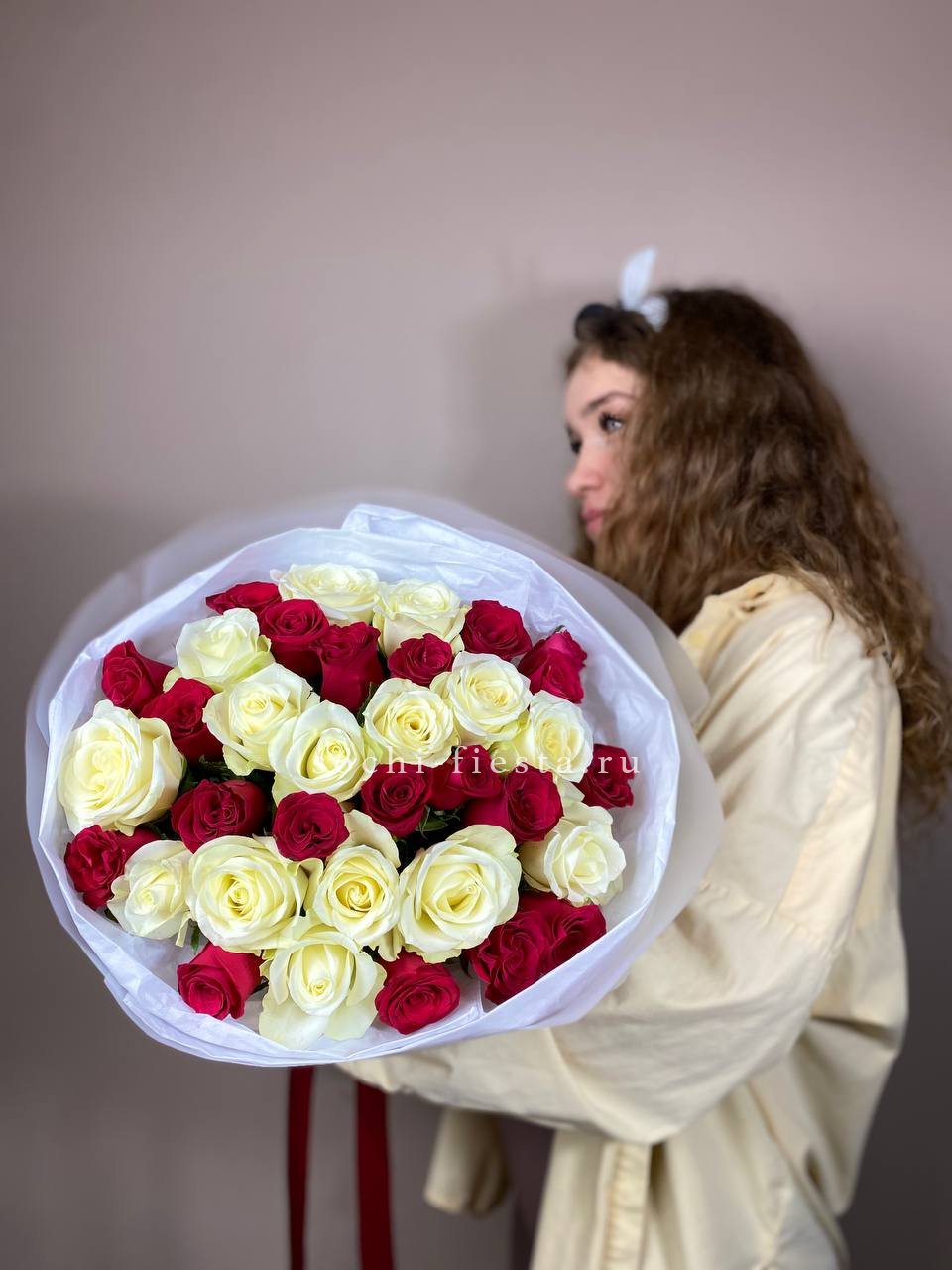 Для заказа товара "Букет из красных белых 35 роз" с доставкой в Махачкале нажмите в корзину