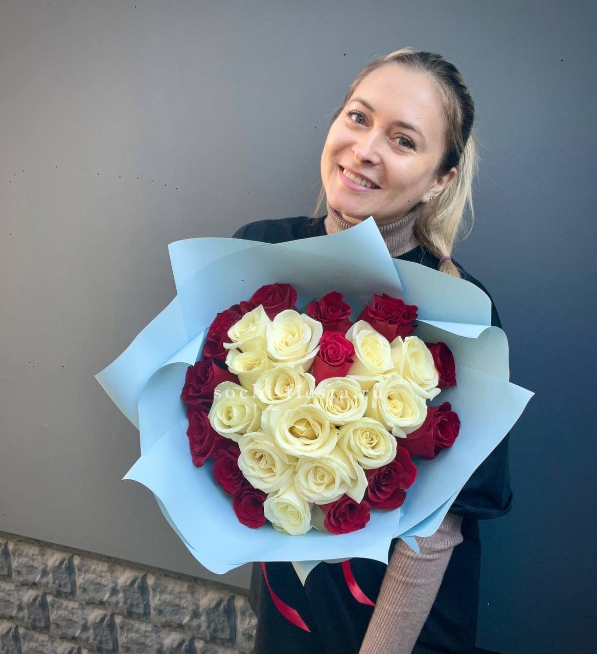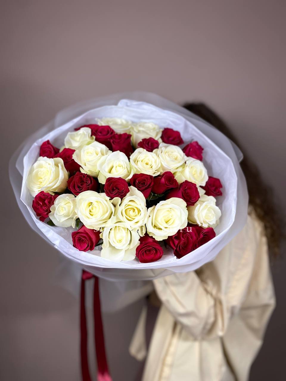 Тридцать пять роз в красно-белой гамме складываются в гармоничную форму с живым ритмом. Бутоны разной степени раскрытия добавляют визуальной глубины всей композиции.