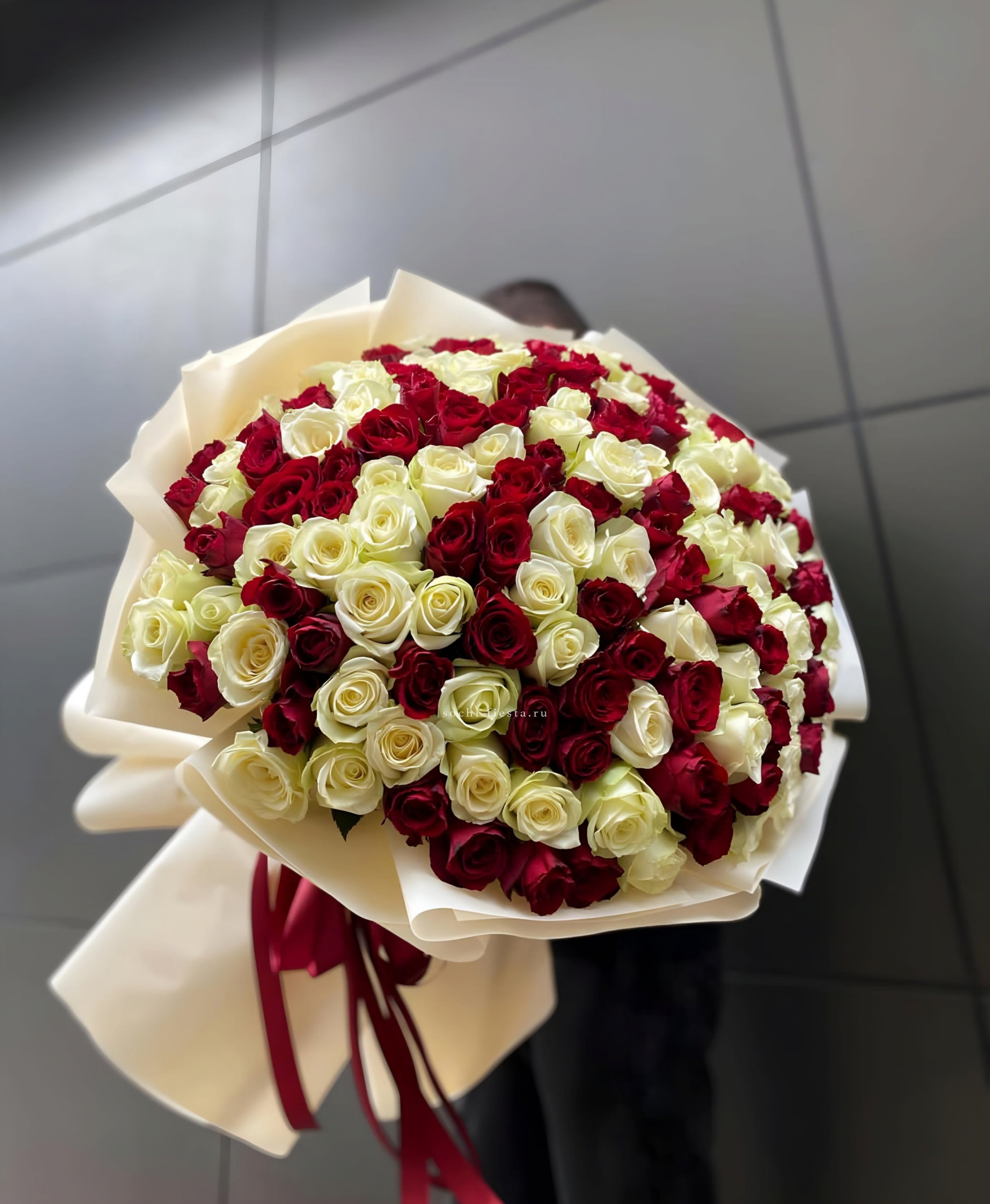 Сорок пять бутонов формируют пышную композицию с заметным присутствием в любом пространстве. Красные и белые розы раскрываются постепенно, сохраняя свежесть несколько дней.