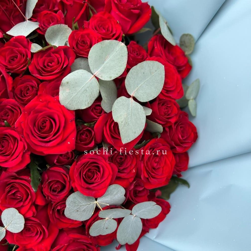 Сто одна белая роза собрана в впечатляющую охапку. Монохромная гамма и повторяющийся ритм бутонов создают мощное визуальное присутствие. Такой объём заполняет пространство и приковывает внимание.