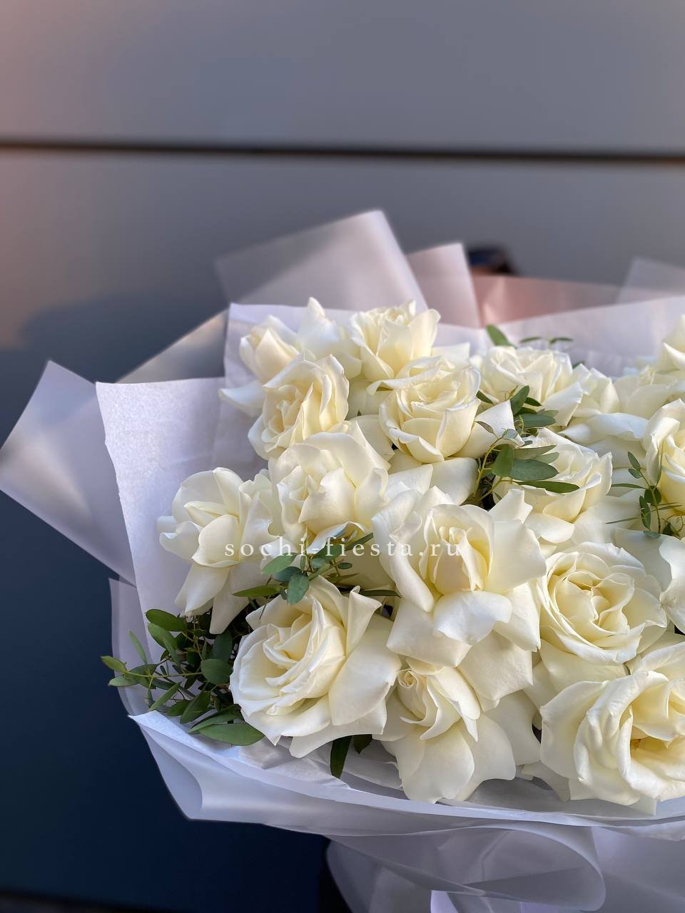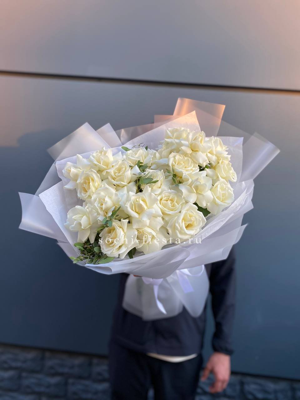 Розы сорта Siena раскрываются медленно, сохраняя плотность лепестков несколько дней. Пятнадцать бутонов образуют объёмную композицию с выразительной фактурой. Белый цвет остаётся безупречным.