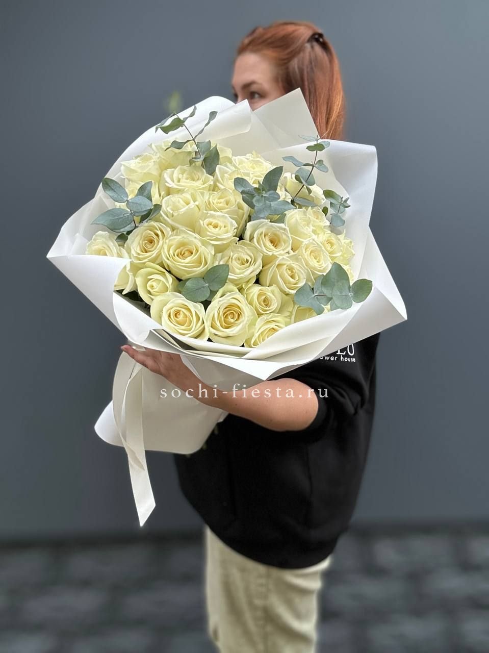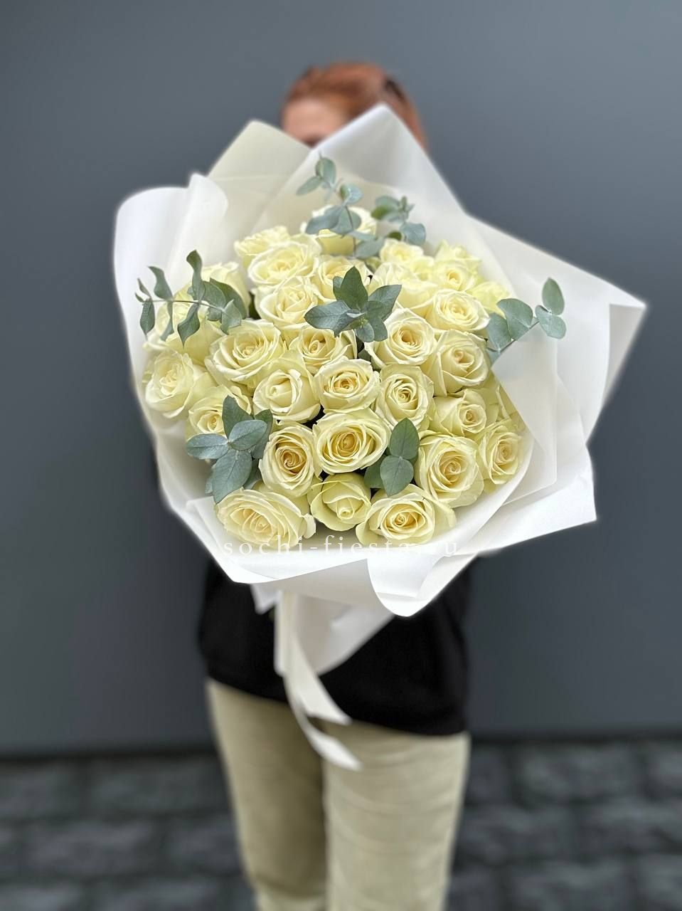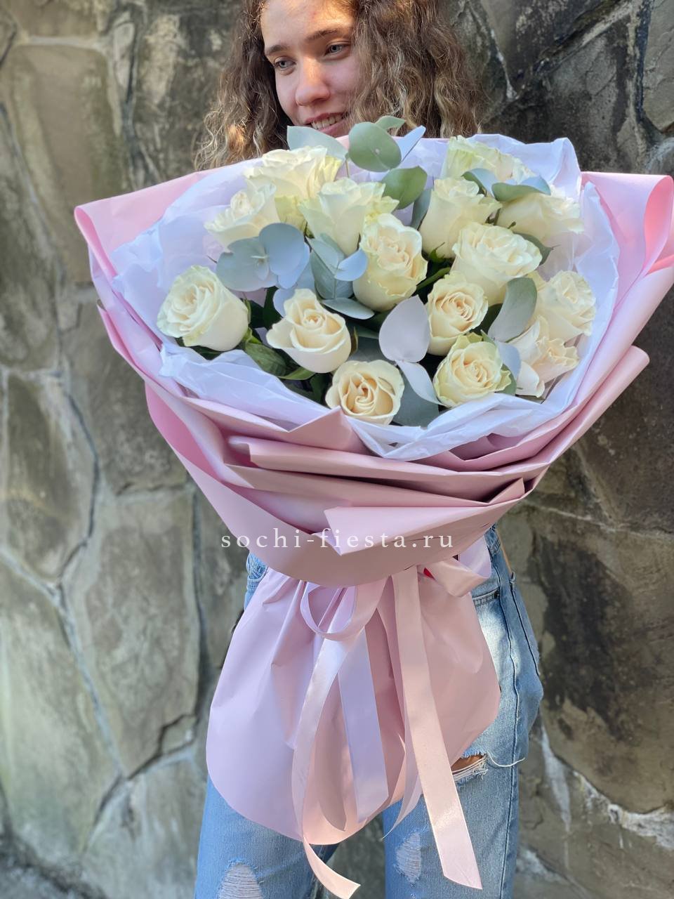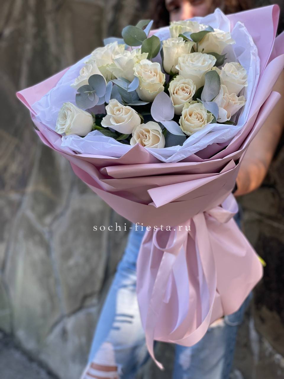 9 белых роз, декоративная зелень, дизайнерская упаковка.