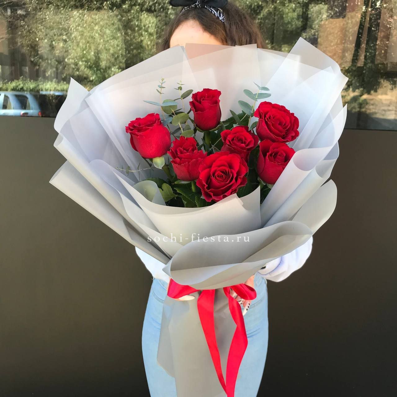 19 алых роз, лента, оформление.