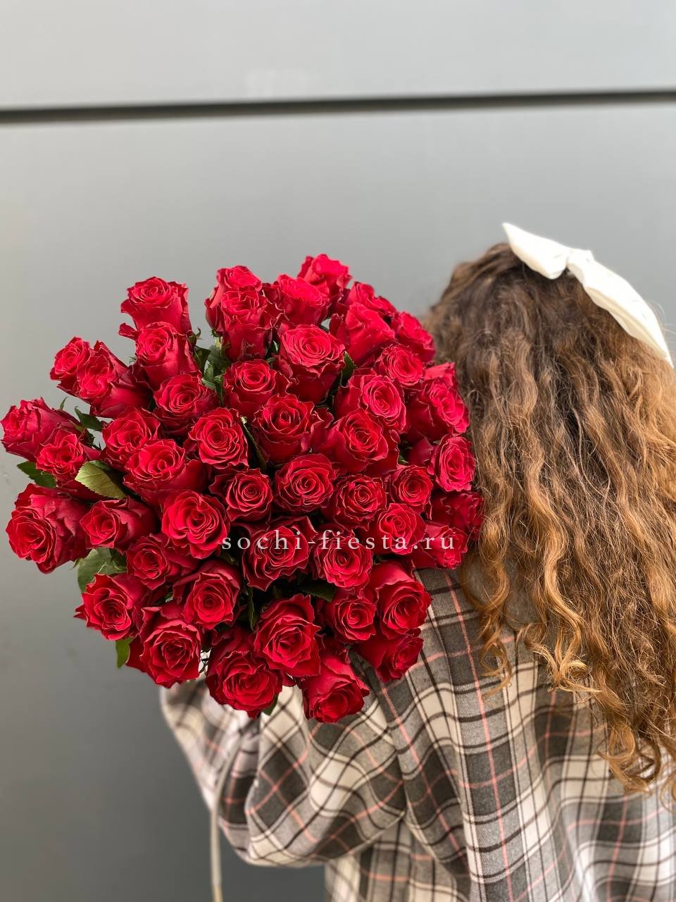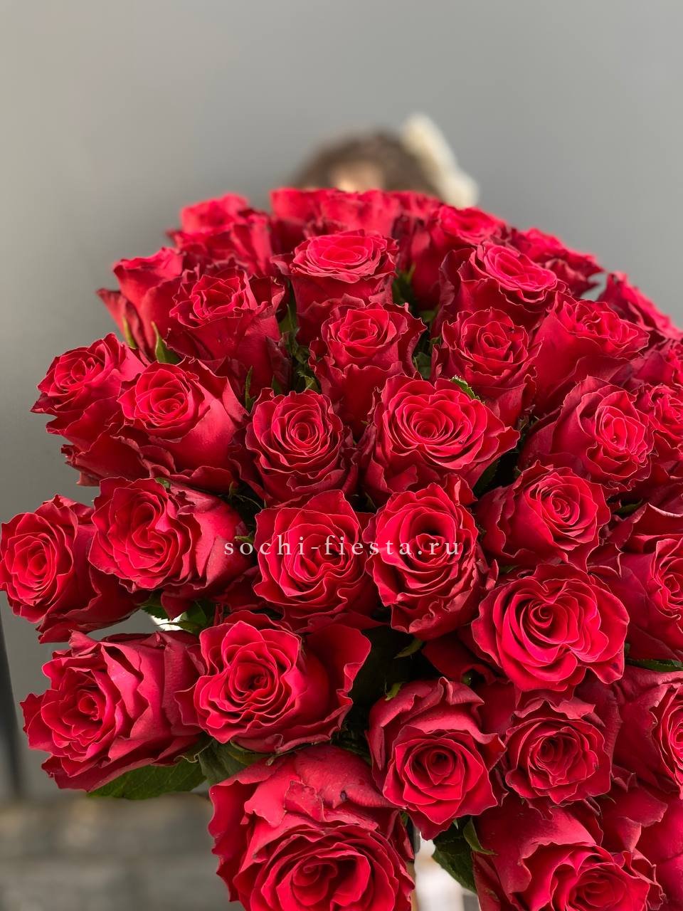 Красный монохром из пятидесяти одной розы притягивает взгляд своей насыщенностью. Крупная композиция заполняет пространство и создает яркое визуальное впечатление.