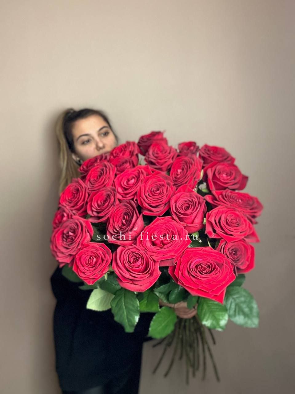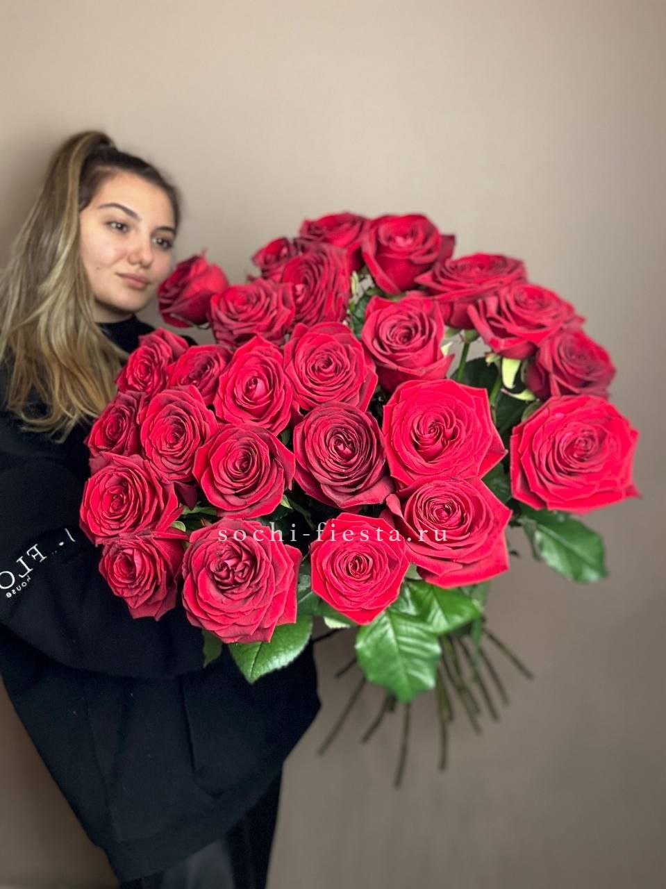 Compliment — это двадцать пять красных роз на длинных стеблях, собранных в классическую форму. Букет держит форму несколько дней и остаётся аккуратным даже в высокой вазе.