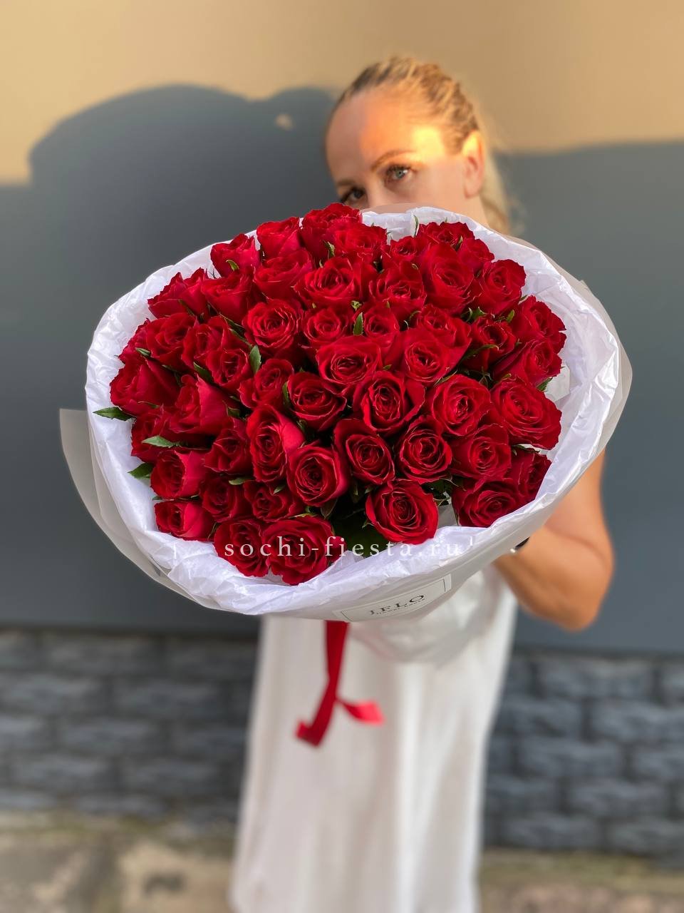 Пятьдесят пять роз собраны в плотную округлую форму с чёткими линиями и уверенным силуэтом. Букет держит структуру и создаёт ощущение завершённости.
