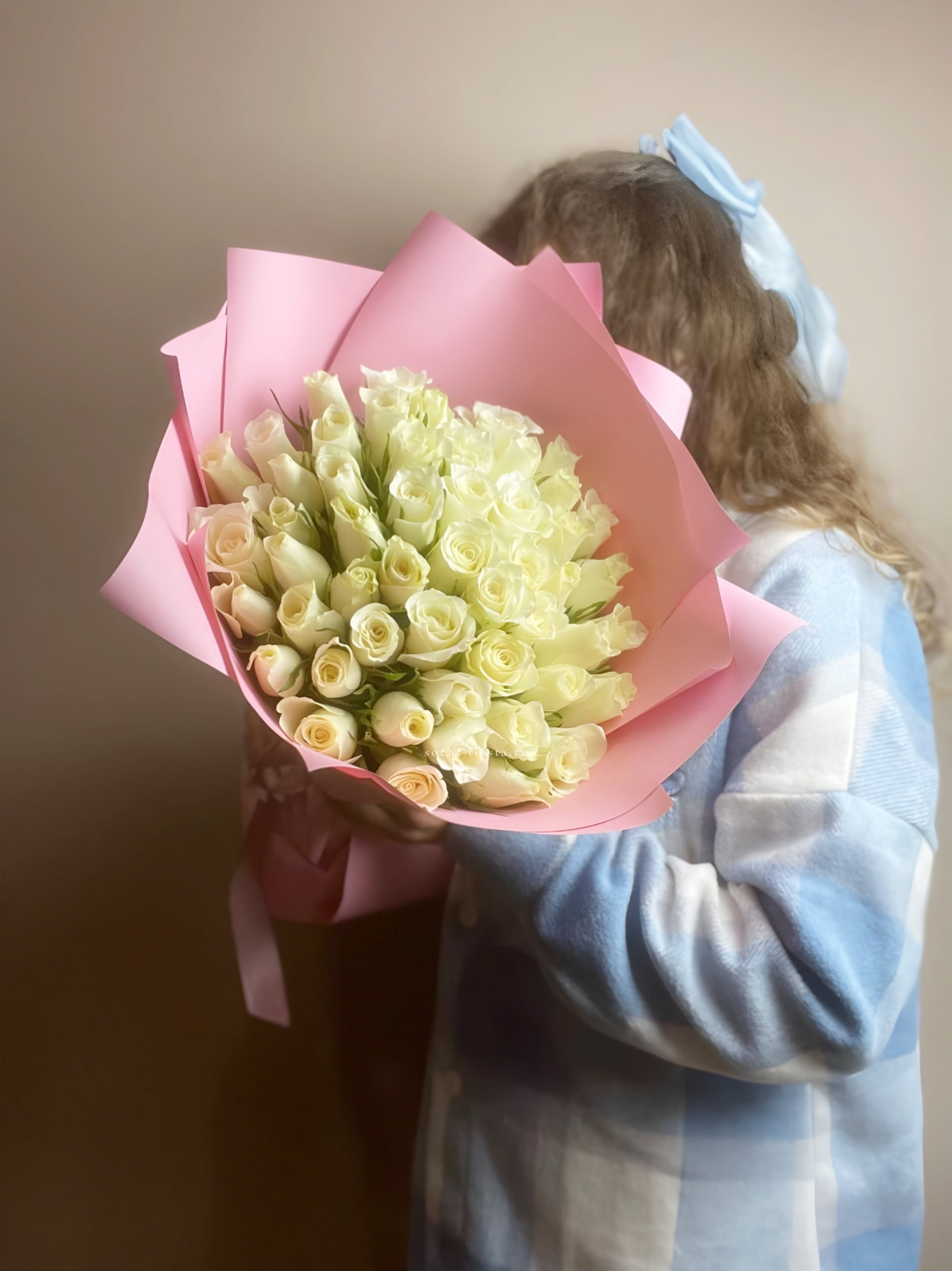 Белоснежные бутоны раскрываются ровными рядами, создавая чистую графичную форму. Пятьдесят один цветок образует объемную композицию, где каждая роза сохраняет свежесть и четкость линий. Букет для тех, кто ценит лаконичность.