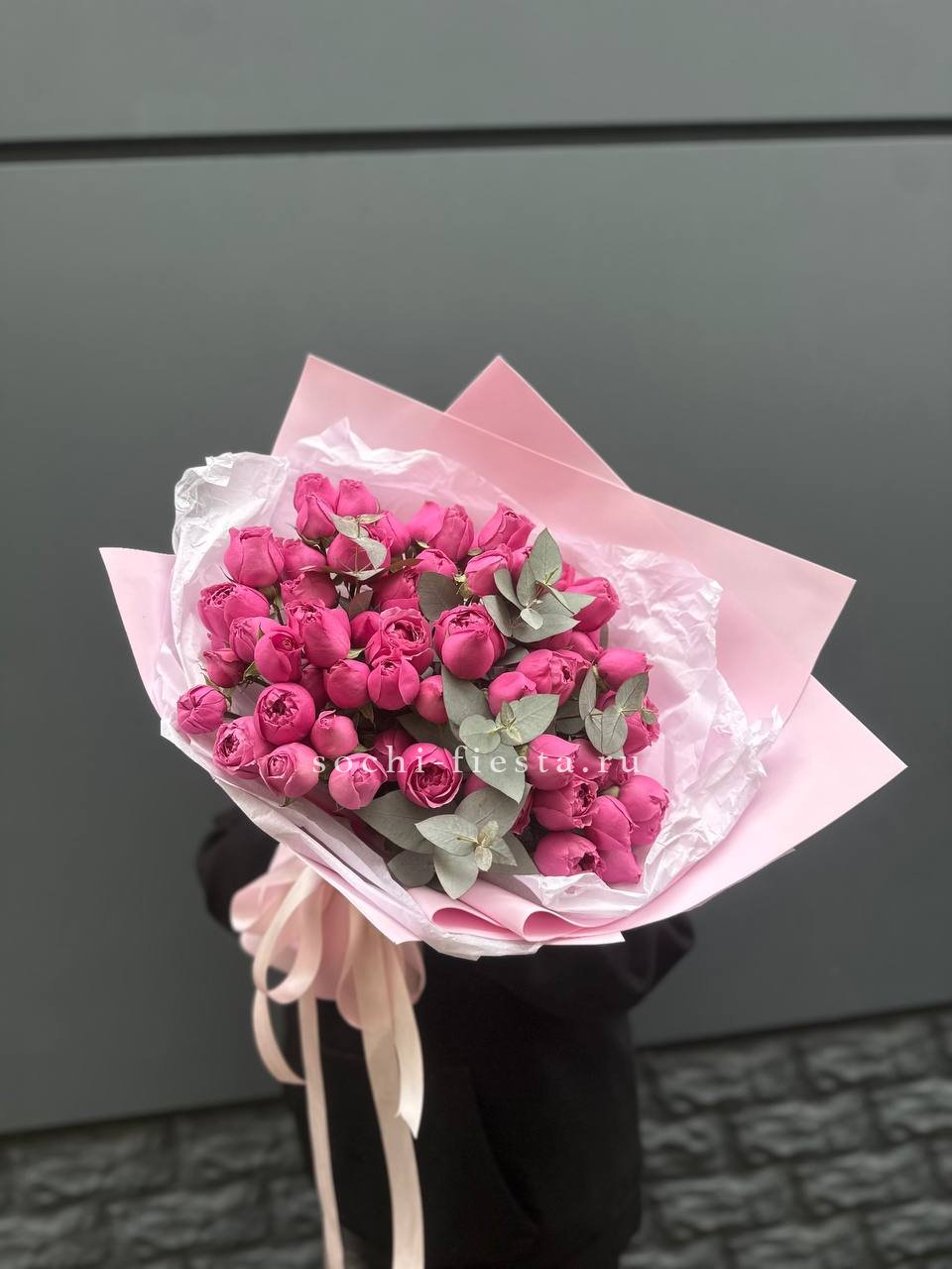 Пятнадцать веточек с множеством небольших бутонов формируют воздушную форму. Букет легко помещается в любую вазу и сохраняет свежесть долгое время благодаря природной стойкости кустовых сортов.