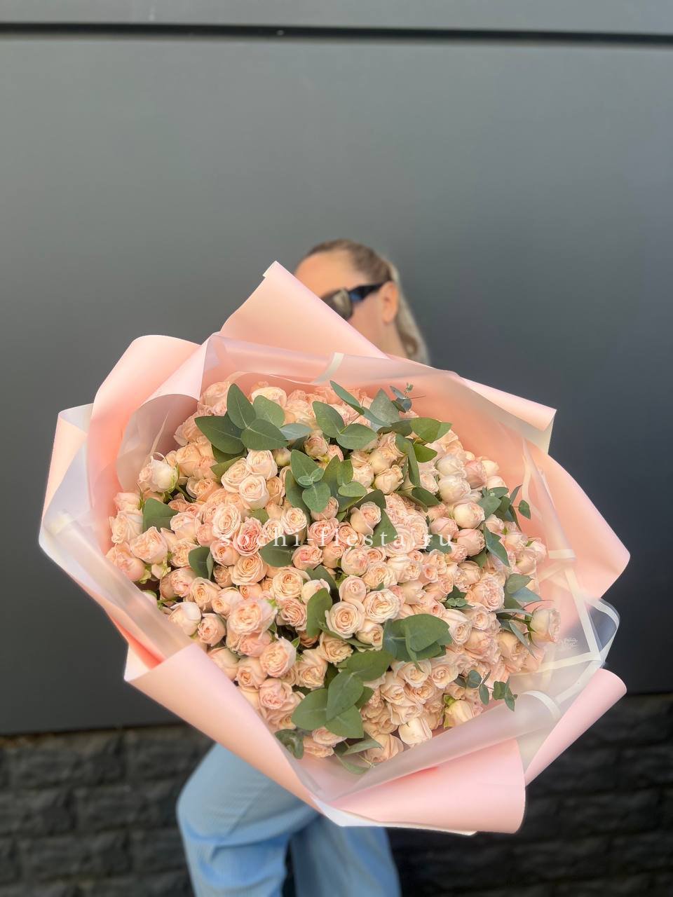 Тринадцать кустовых роз Bombastic в дизайнерской упаковке раскрывают объемные бутоны персикового тона. Их махровая текстура напоминает старинные садовые цветы с характерной пышностью.
