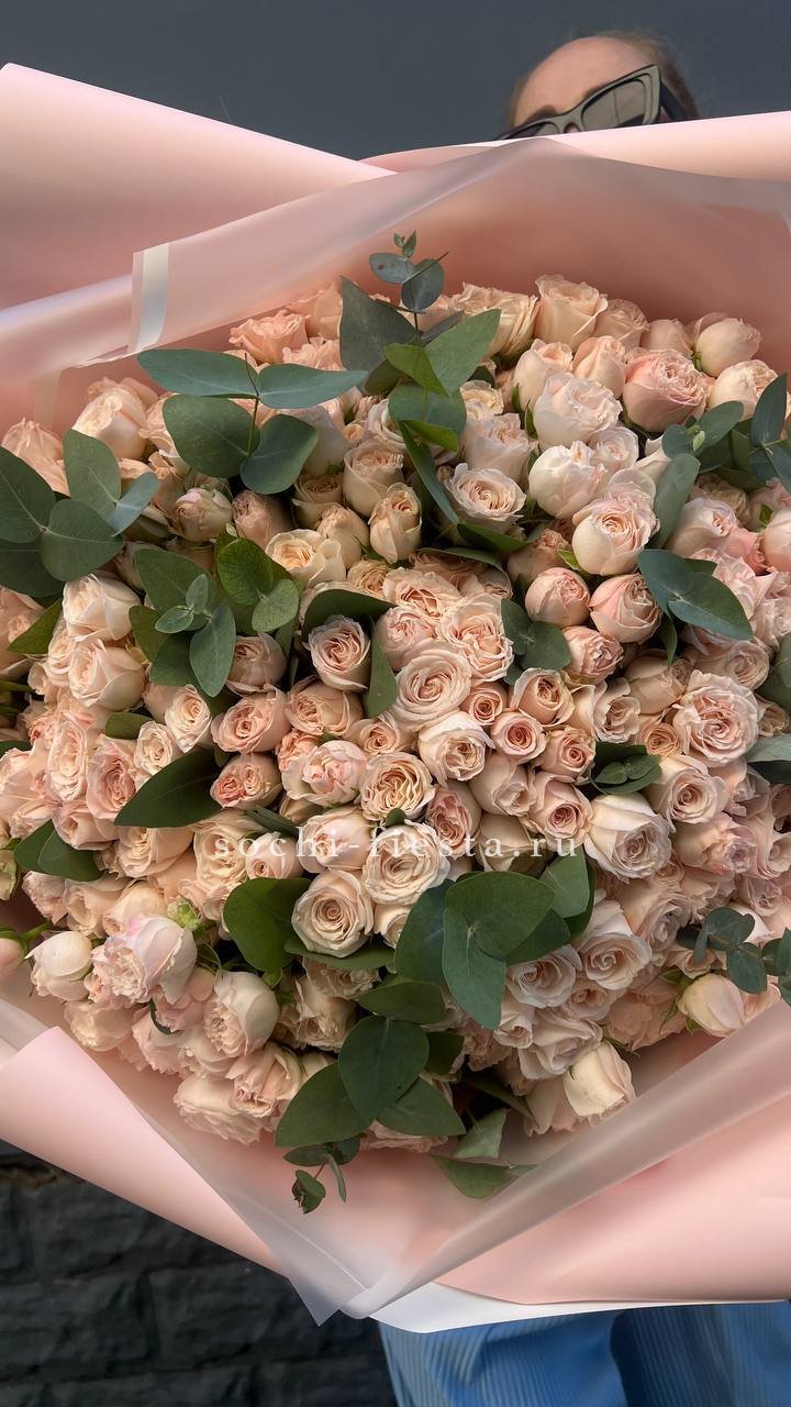 101 кремовая кустовая роза, эвкалипт, лента, дизайнерская упаковка.