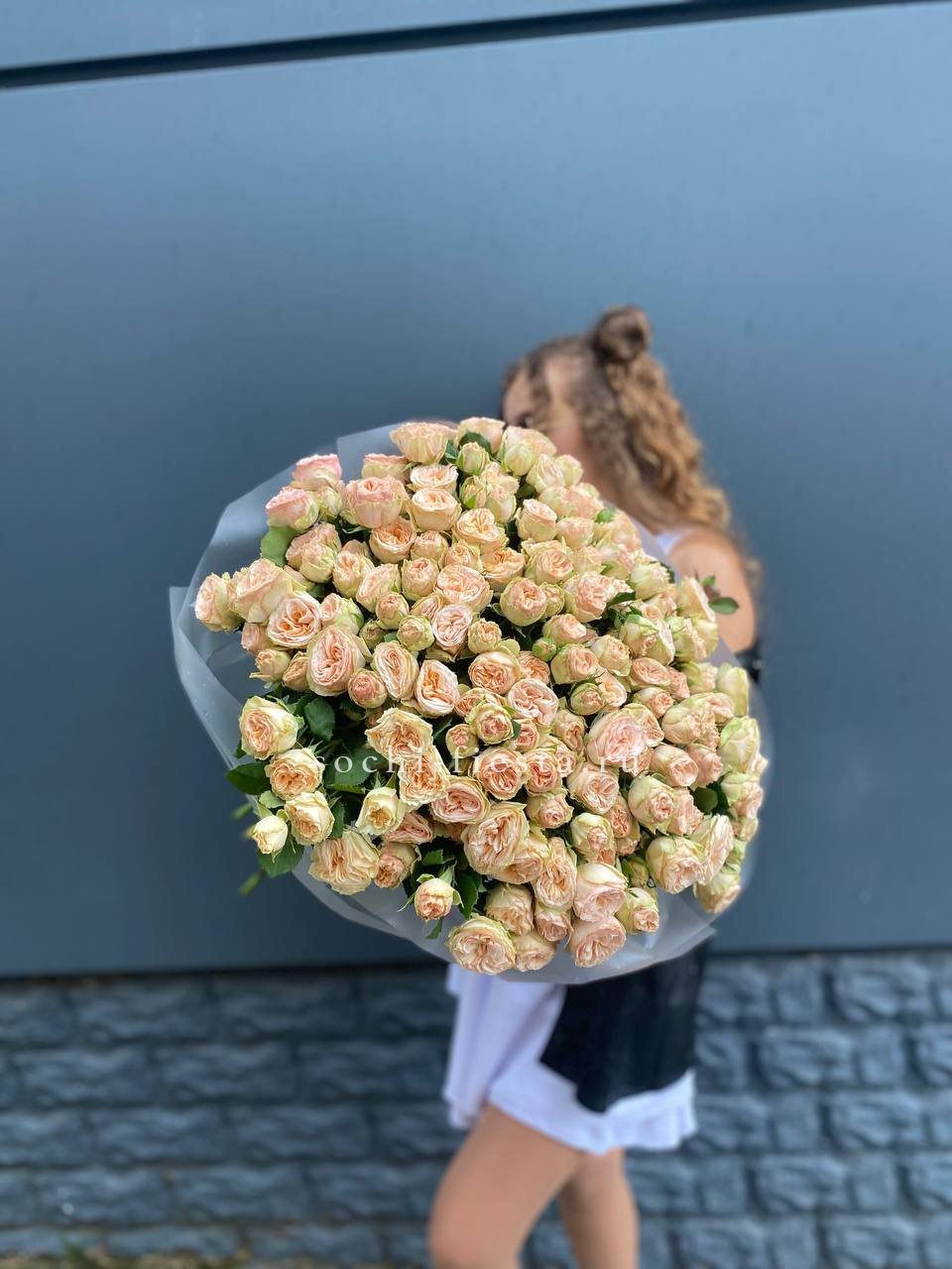 кустовая пионовидная роза, лента, дизайнерская упаковка.