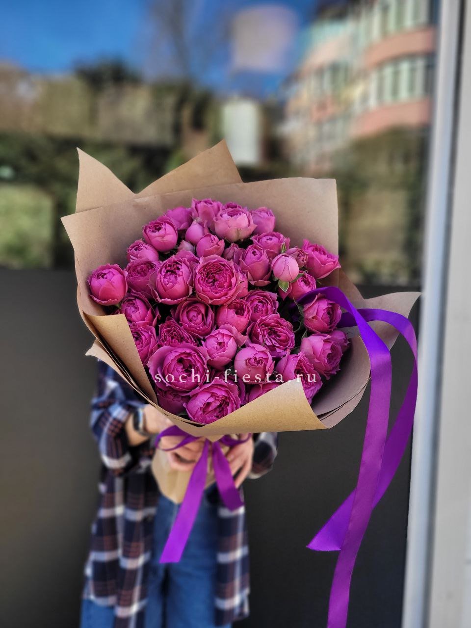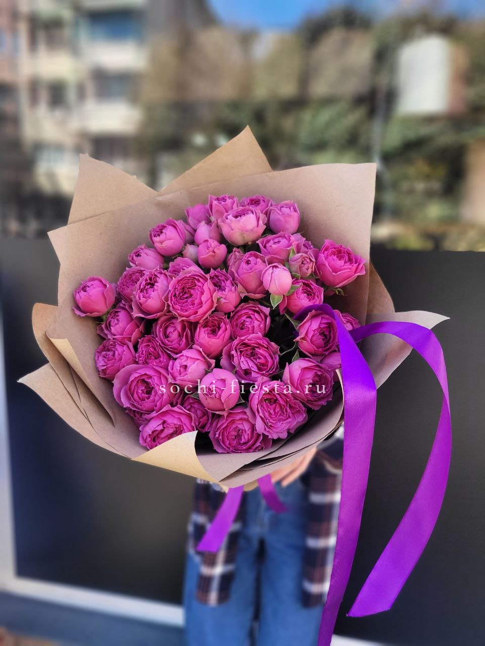 пионовидные кустовые розы в сиреневых или розовых оттенках, лента, крафт.