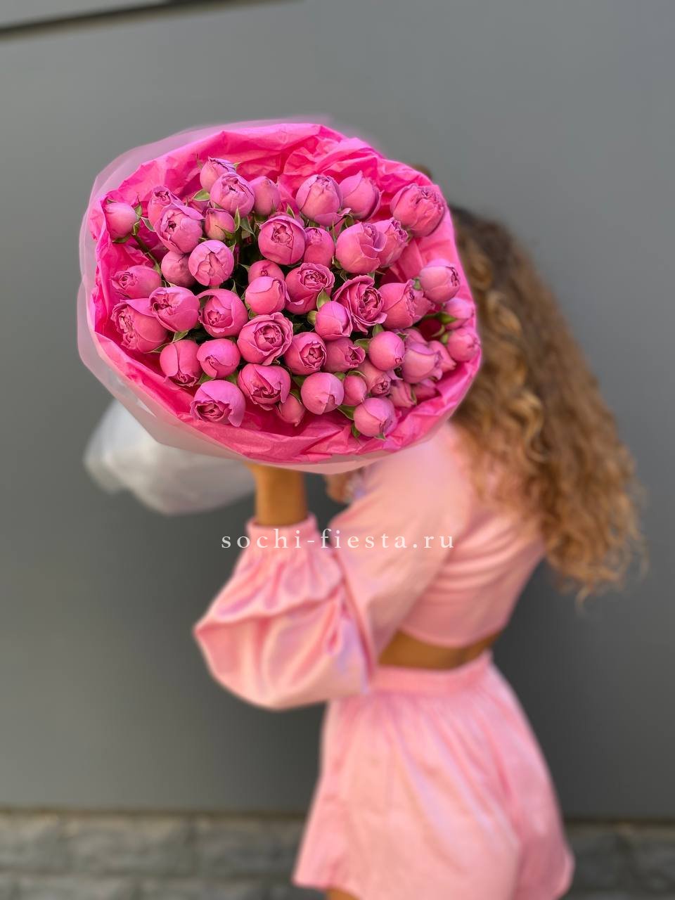Двадцать пять пионовидных роз в плотной округлой форме создают объёмное облако нежно-розового оттенка. Сорт Pink X-Pression с густомахровыми бутонами собран под ленту без дополнительного декора.