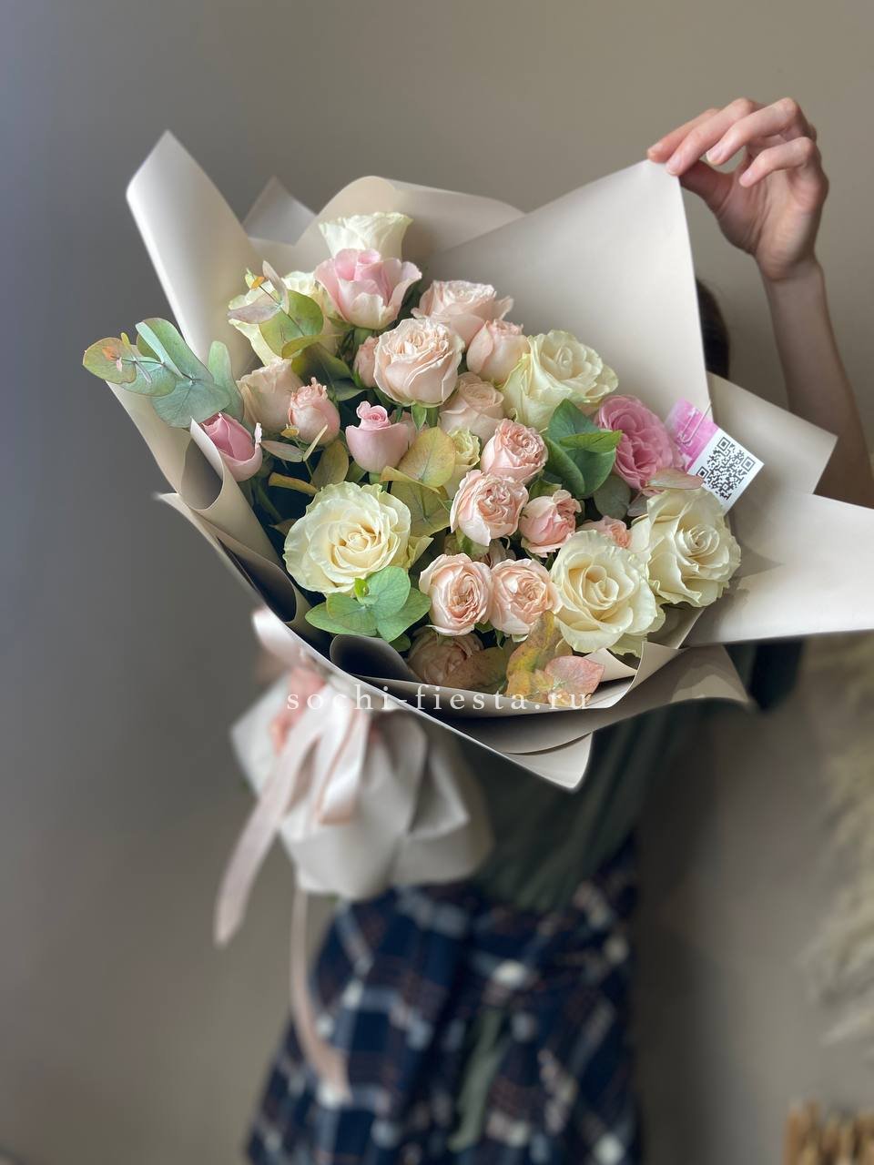 Белые розы и эустома образуют воздушный объем, где каждый бутон дышит свободно. Диантус добавляет графичности, а эвкалипт создает прохладную дымку по краям. Букет для тех, кто ценит легкость и современную флористику.