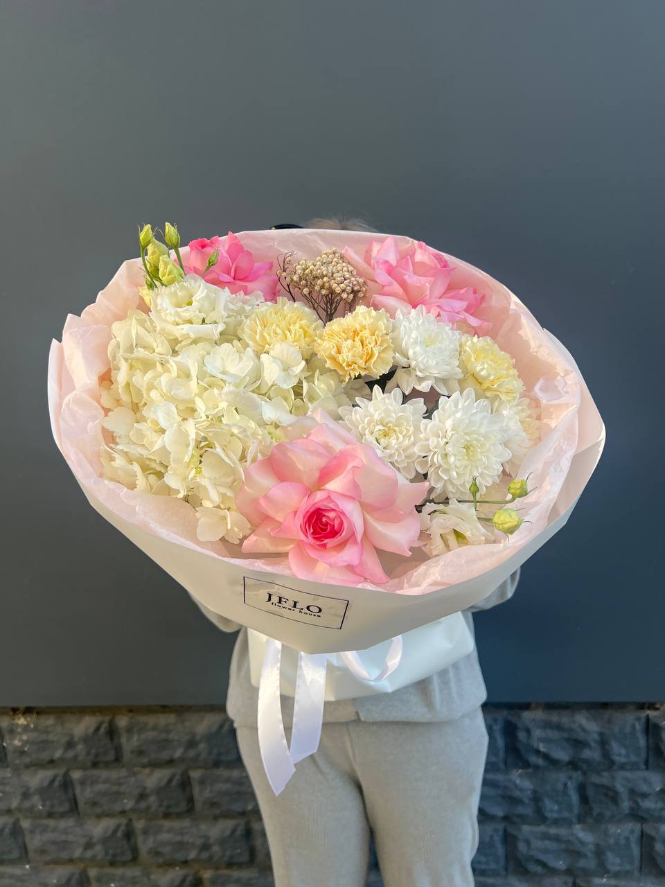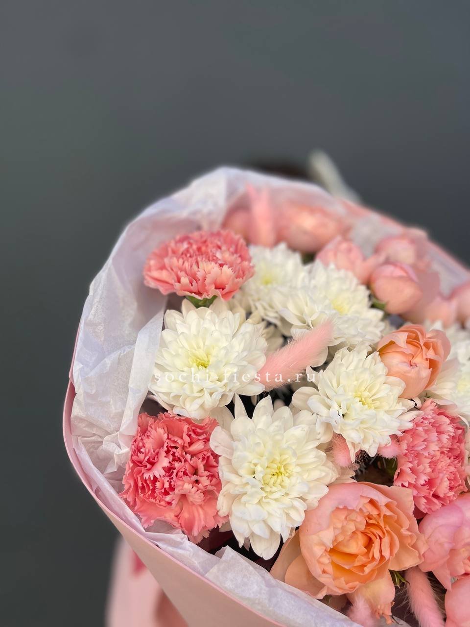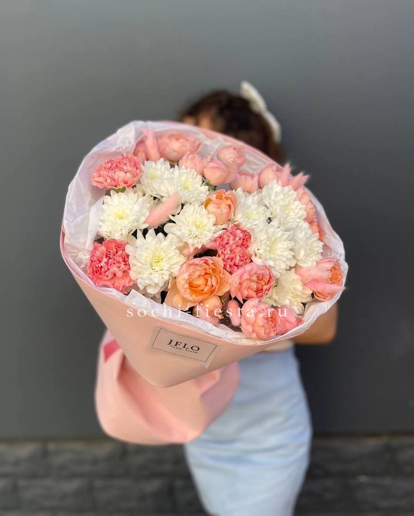 Воздушная композиция собирает кустовую хризантему, эустому и диантус в единый ритм. Озотамус и эвкалипт задают структуру, сохраняя свежесть надолго.