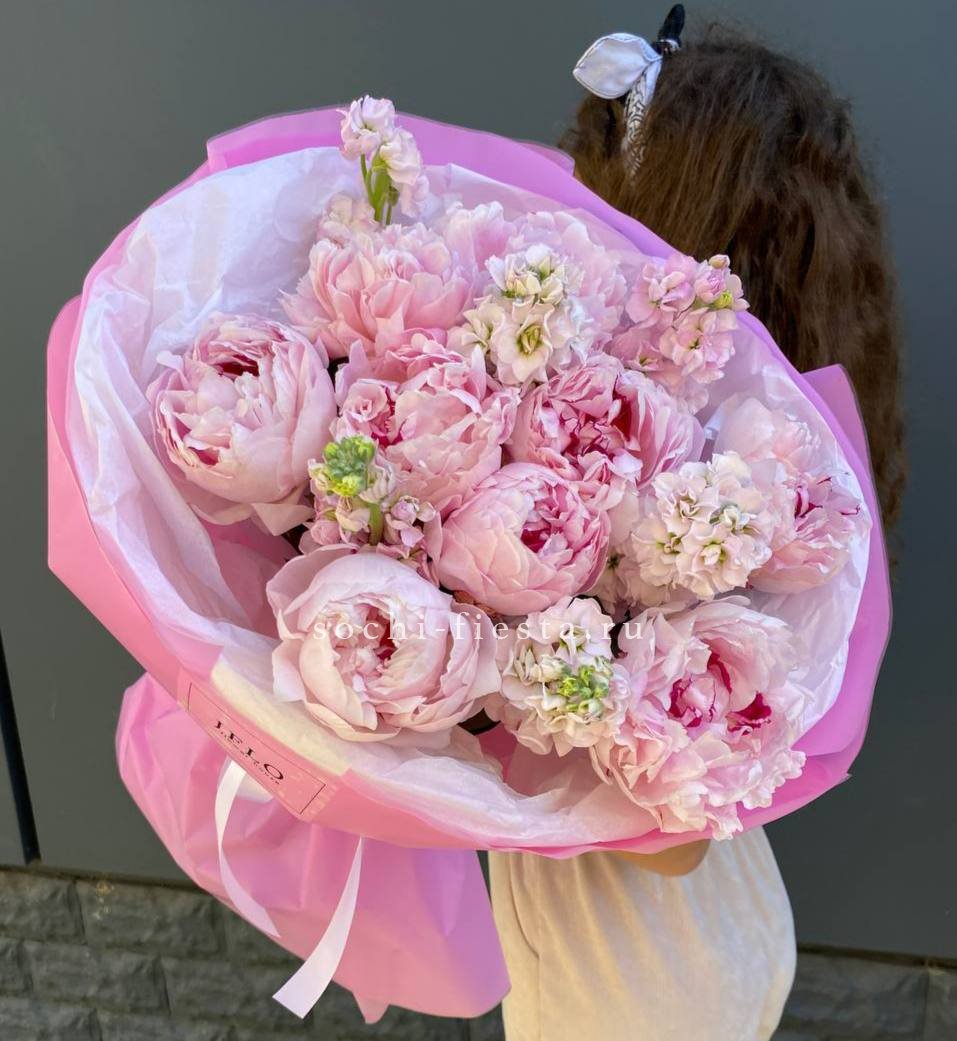 Пышные бутоны пионов с воздушной маттиолой собраны в композицию с мягкими линиями. Тишью и лента завершают образ, добавляя лёгкости и объёма.