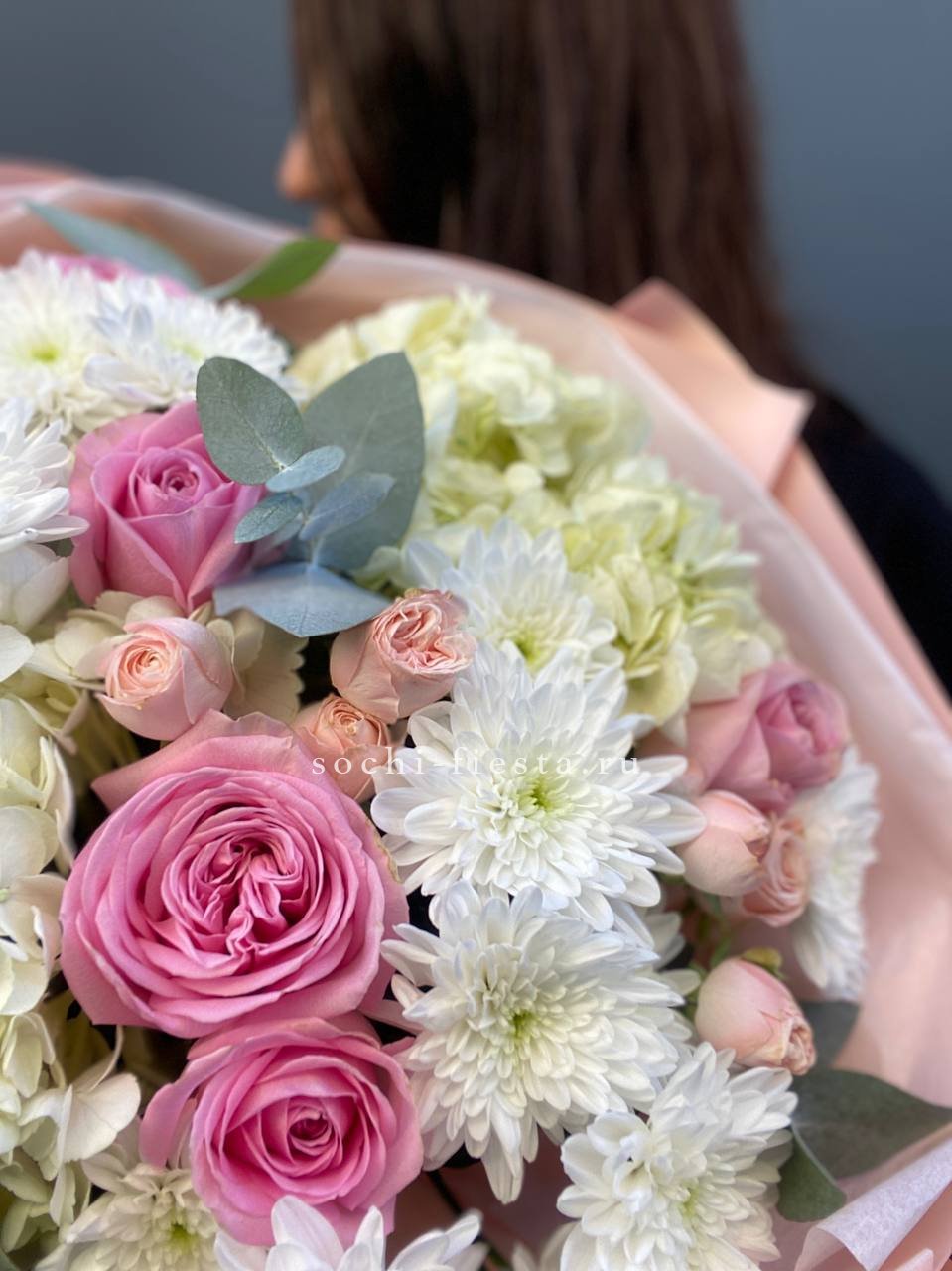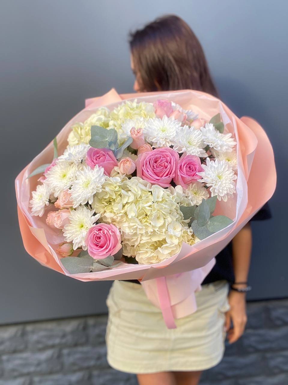 Французские розы и кустовые хризантемы собраны в букет с плотной текстурой и мягким переходом оттенков. Композиция держит форму и долго сохраняет свежесть.