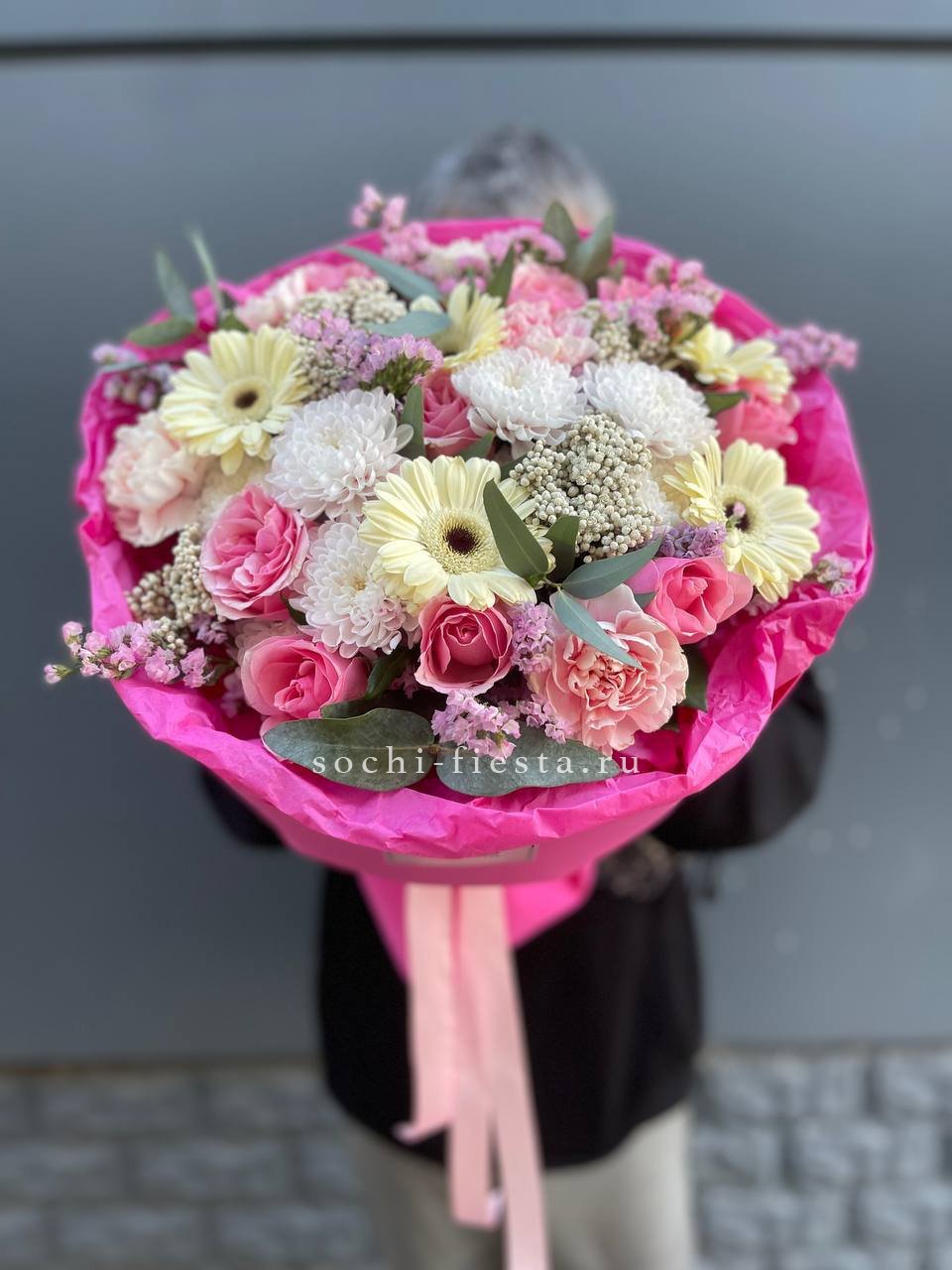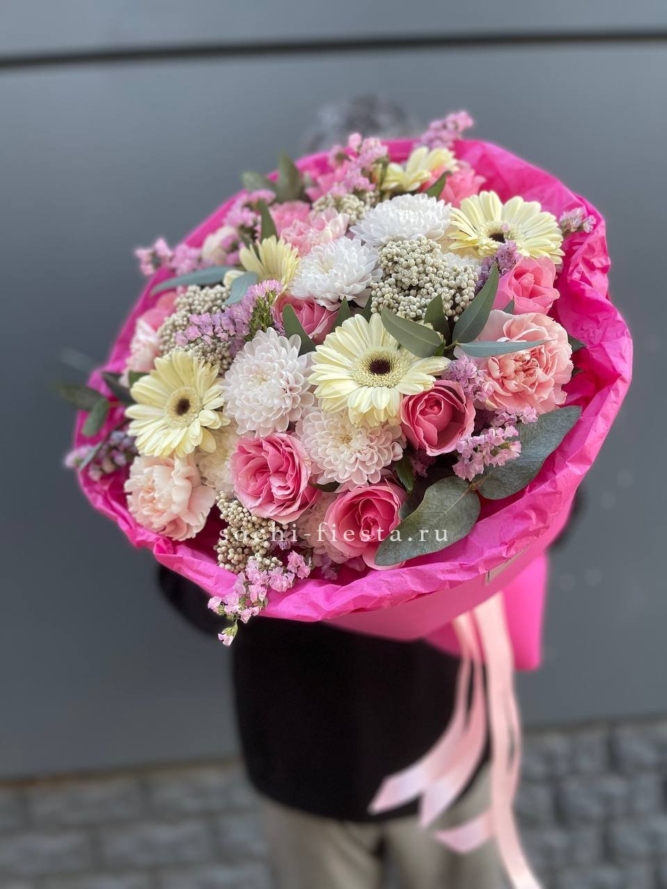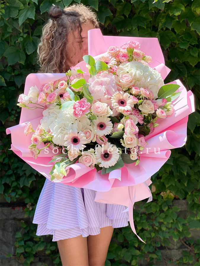 гортензия, хризантема, хамелациум, гербера, мисти баблс, диантус, пленка.