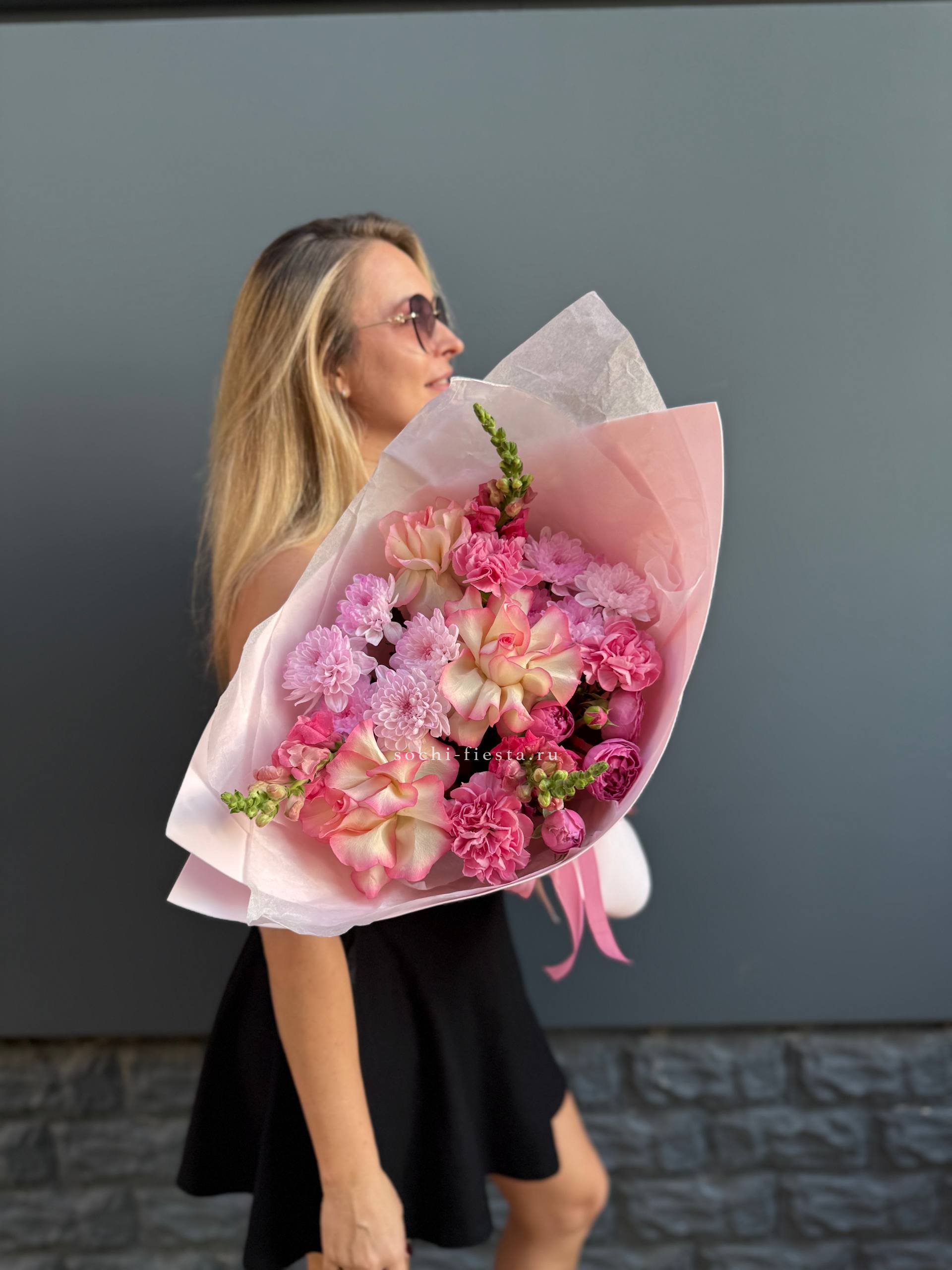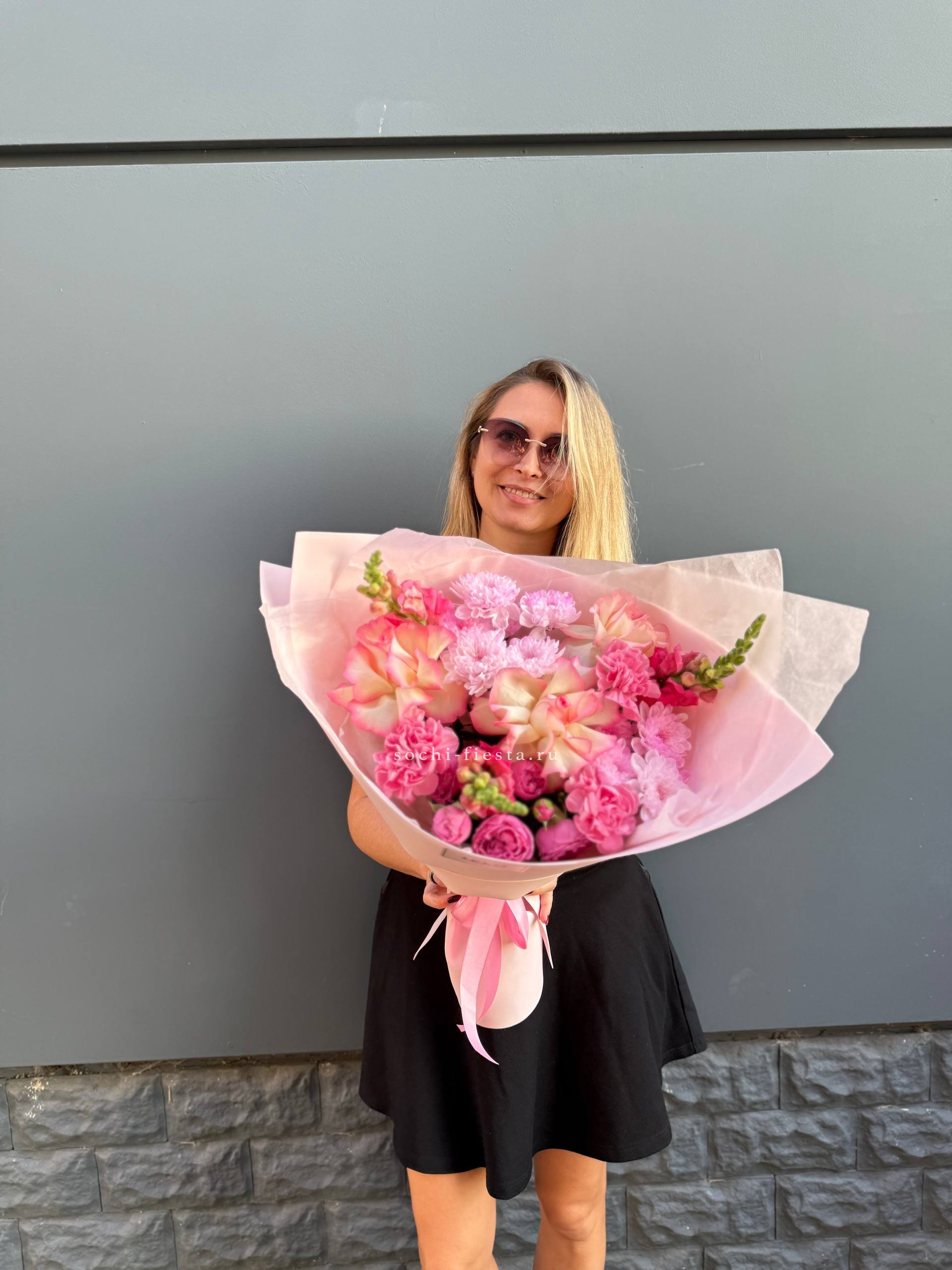 Розовые розы и диантусы окружены пышными соцветиями маттиолы и бомбастика. Композиция собрана плотно, каждый цветок поддерживает соседний, создавая объемную округлую форму. Букет держит силуэт и выглядит цельно с любого ракурса.
