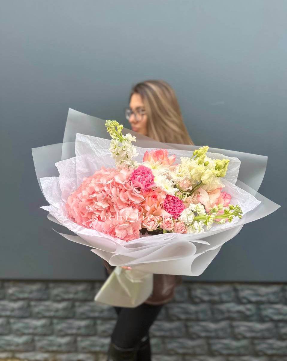 Яркая композиция объединяет пышную гортензию, игривые соцветия диантуса и солнечные хризантемы. Бомбастик добавляет объёма, а озотамнус создаёт лёгкую воздушность между крупными бутонами. Букет радует глаз насыщенными красками и жизнерадостным характером.