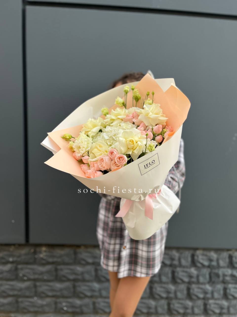 Гортензия образует пышную основу, сквозь которую проступают светлые головки эустомы и роз. Бомбастик вносит графичность, создавая объём и глубину.