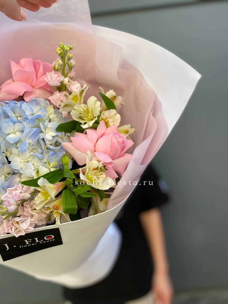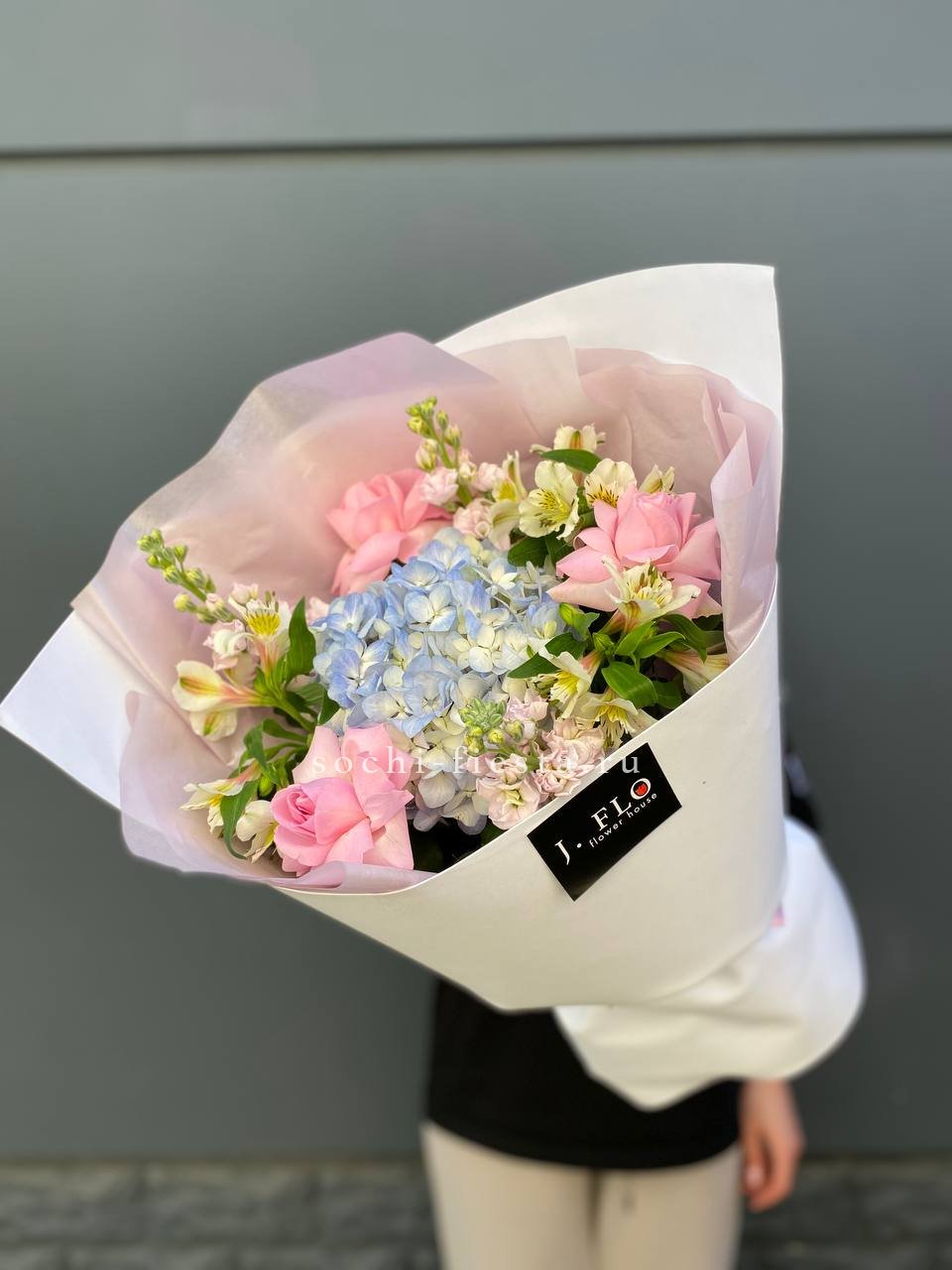 Гортензия задаёт пышную основу, а маттиола и лимониум наполняют букет текстурной глубиной. Французские розы и ковыль создают динамику, которая оживляет композицию и придаёт ей выразительность.