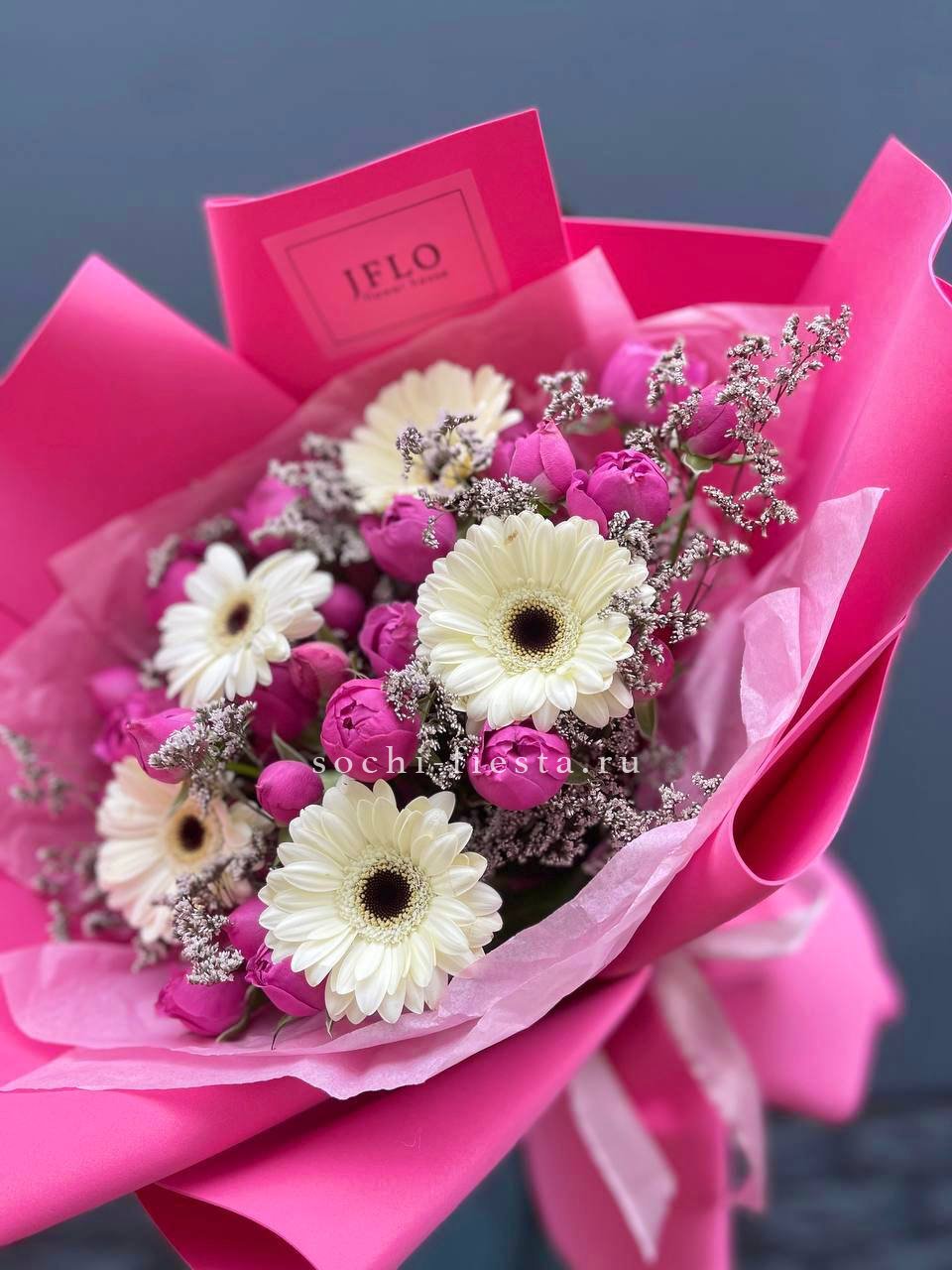 роза, герберы, дельфиниум (замена на маттиолу не в сезон), оформление.