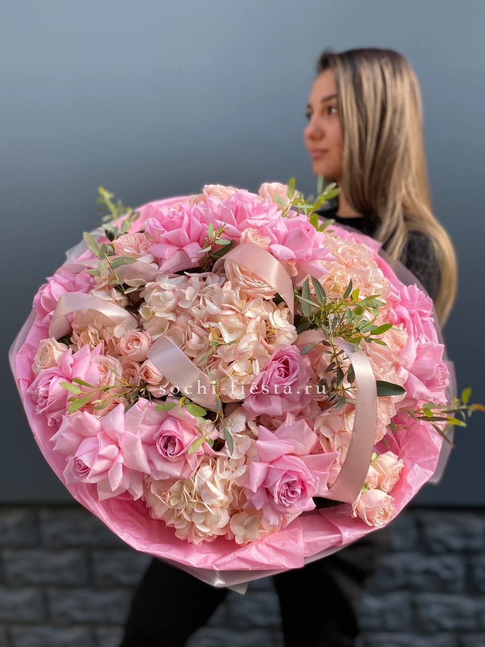 гортензия, роза, кустовая роза, диантус, эустома, дельфиниум, эвкалипт, лента, авторская упаковка.