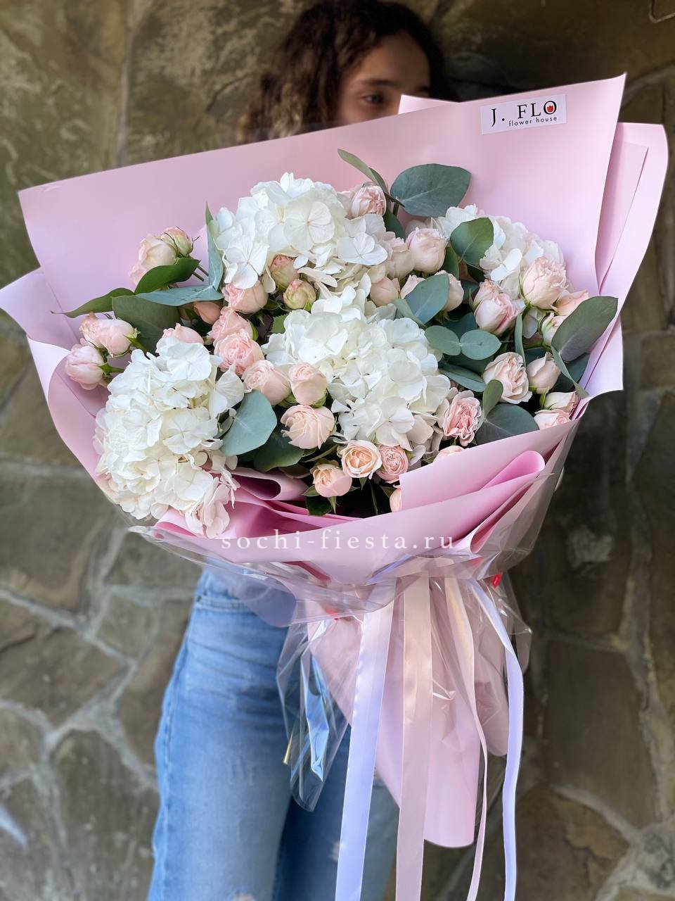 пионовидные розы, розовые пионы, диантусы, эвкалипт, лента, дизайнерская упаковка.