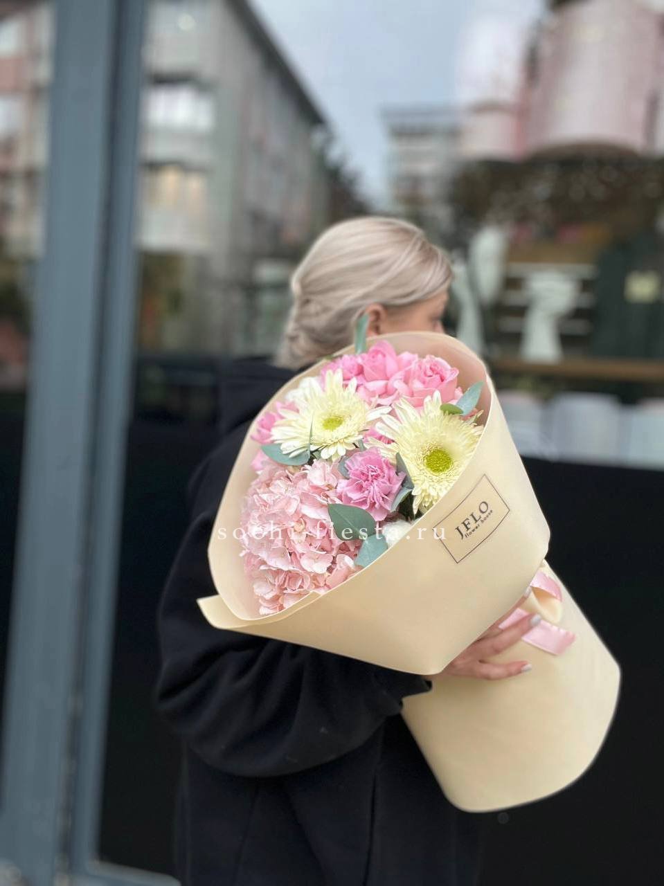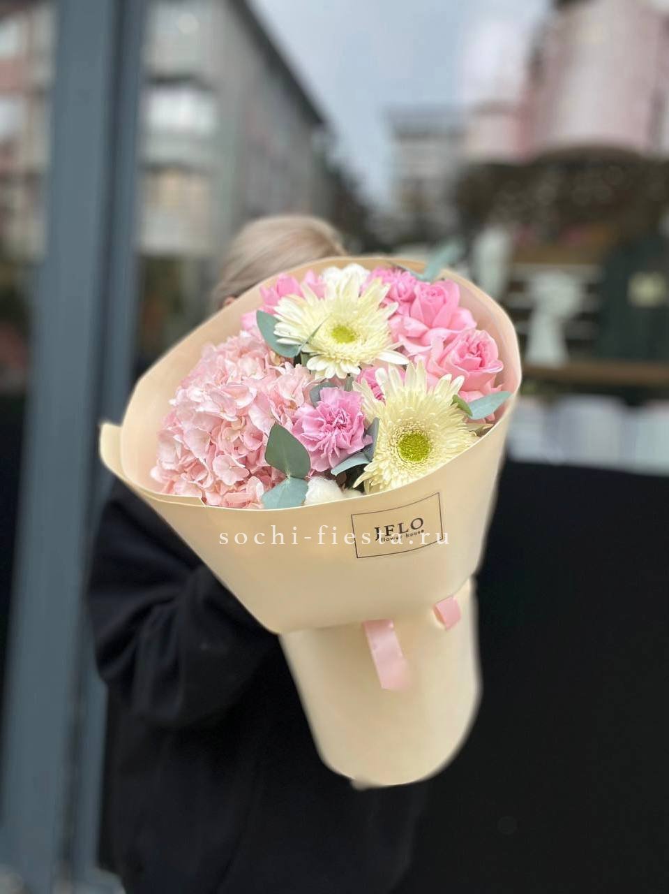 гортензия, пионы, кустовые пионовидные розы, одноголовые розы, дельфиниум (или аналог вне сезона), лента, дизайнерская упаковка.