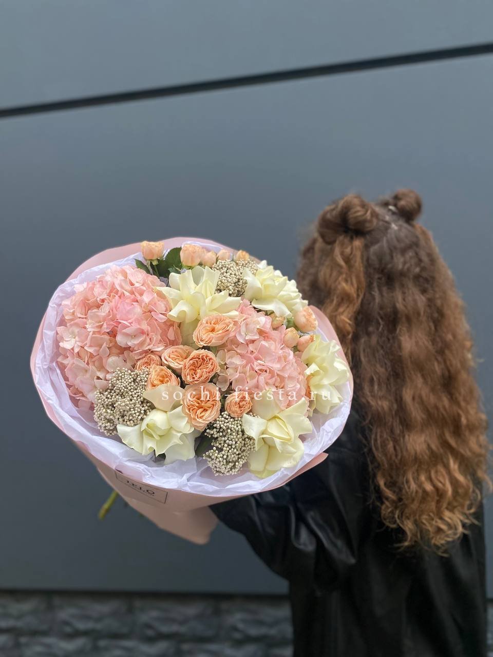 гортензия, пионовидная роза, озотамус, белая роза в нежном оформлении.