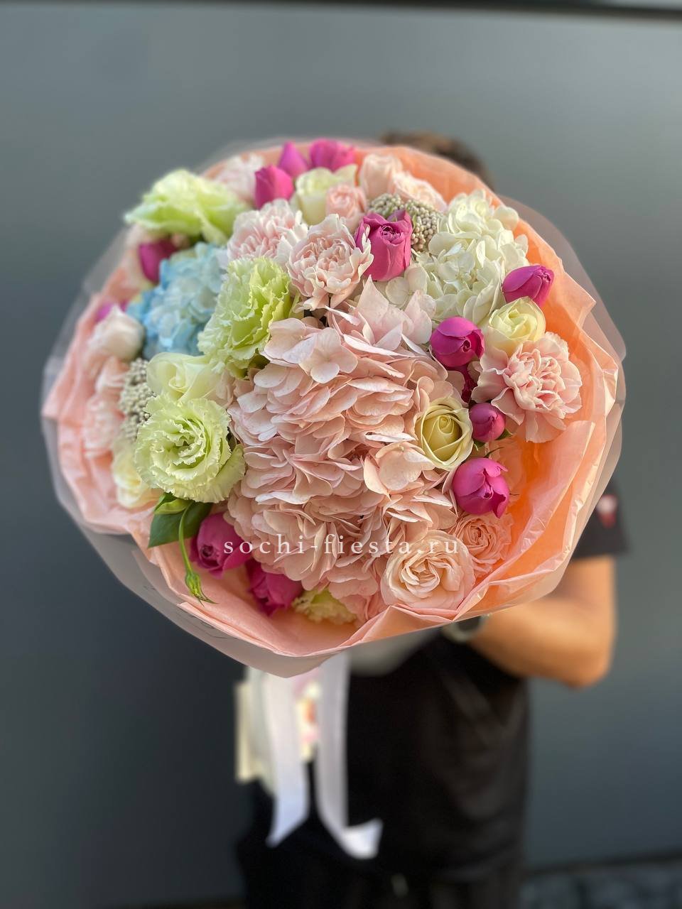 Мягкие пионовидные формы переплетаются с классическими розовыми бутонами в плотной округлой композиции. Эвкалипт освежает палитру и придаёт букету завершённость.