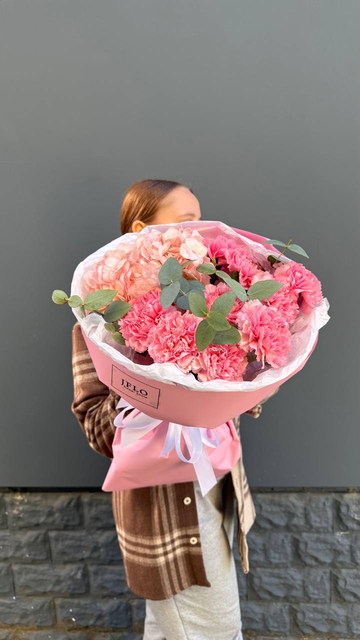 Белые розы и эустома образуют мягкую светлую основу, которая успокаивает взгляд. Диантус и хризантема наполняют букет объёмом, а эвкалипт вносит природную свежесть.