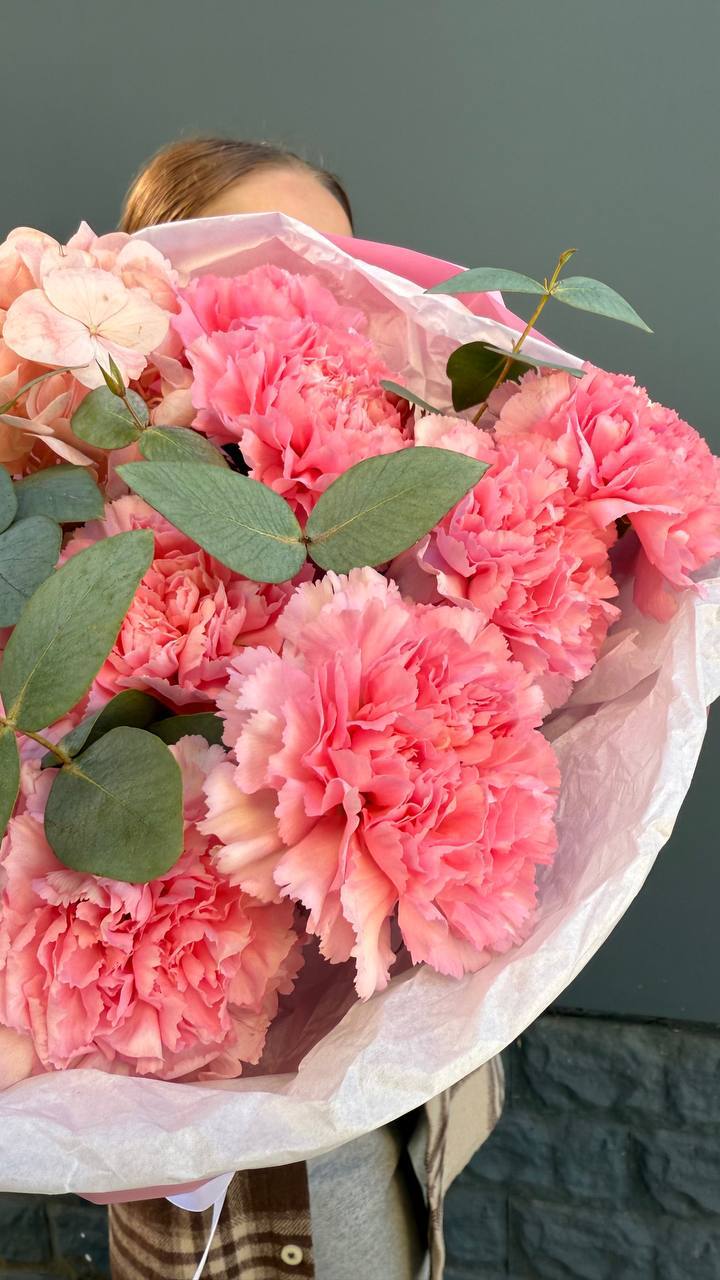 диантус, эустома, хризантема, белая роза, эвкалипт, упаковка.