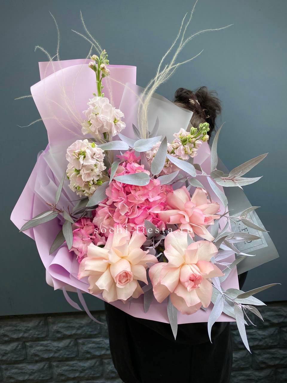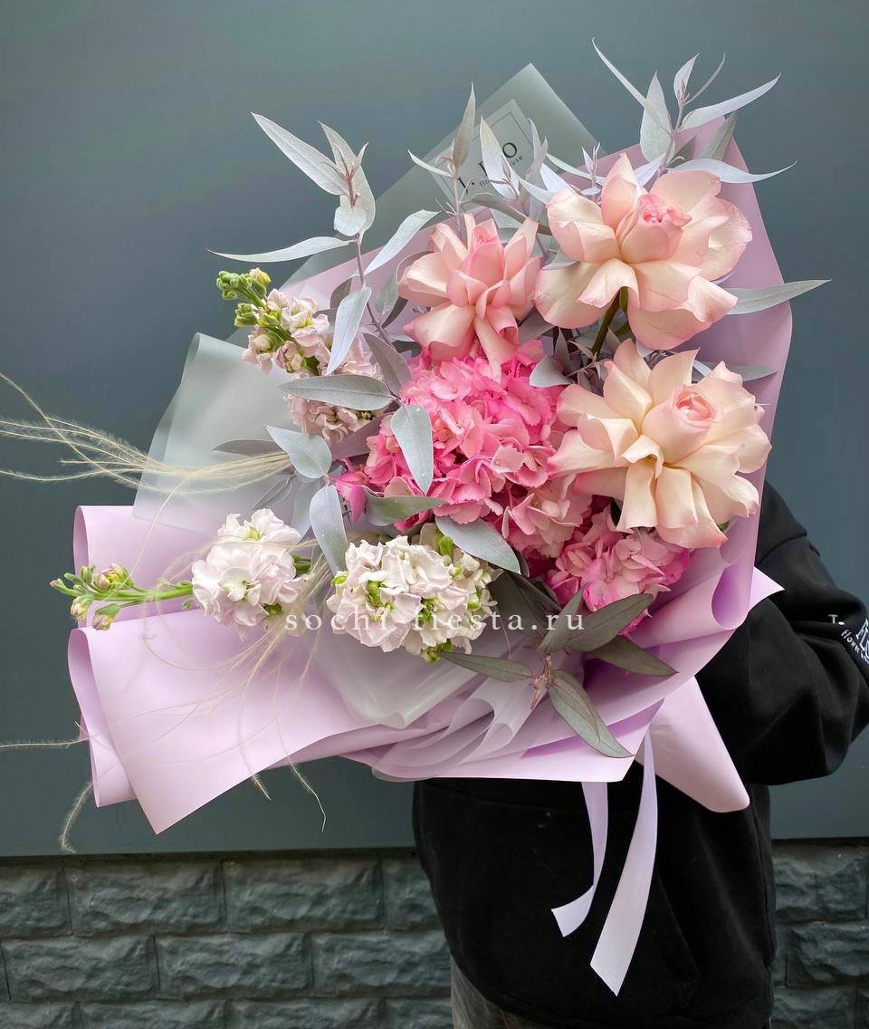 роза одноголовая, кустовая роза, альстромерия, гортензия, эустома, эвкалипт, декоративная зелень, лента, крафт.