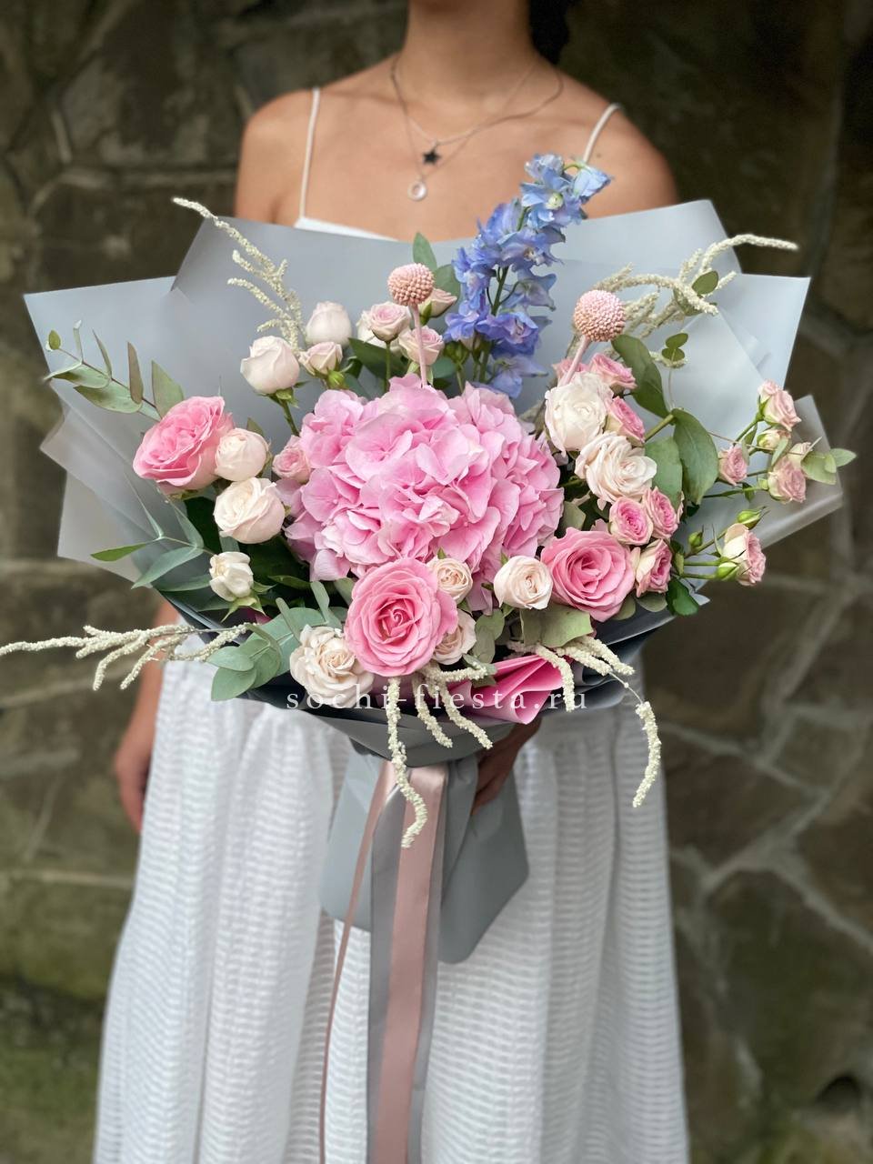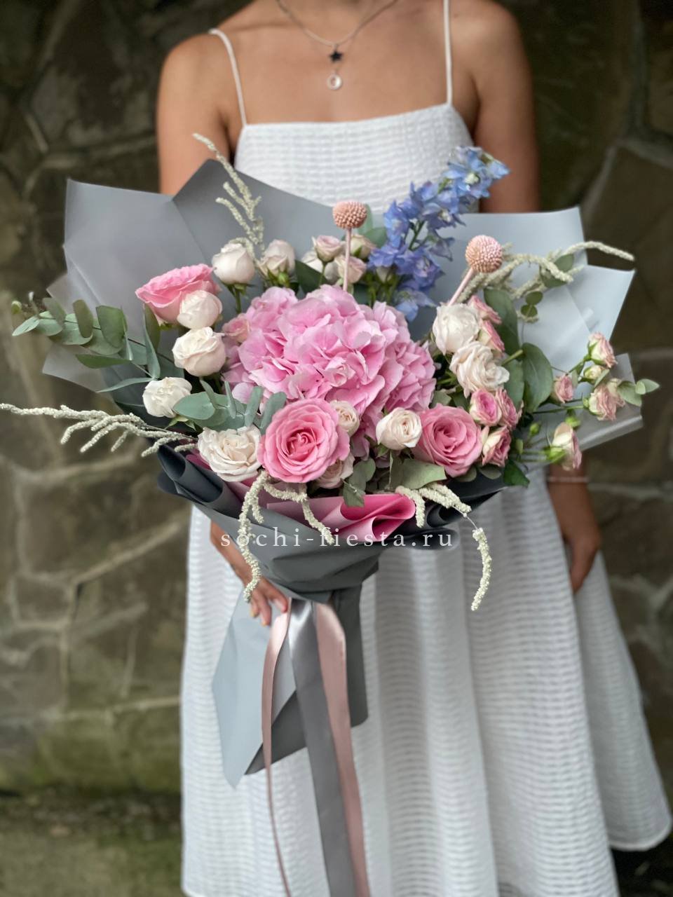 гортензия, сирень, французские розы, диантусы, протея, лента, дизайнерская упаковка.
