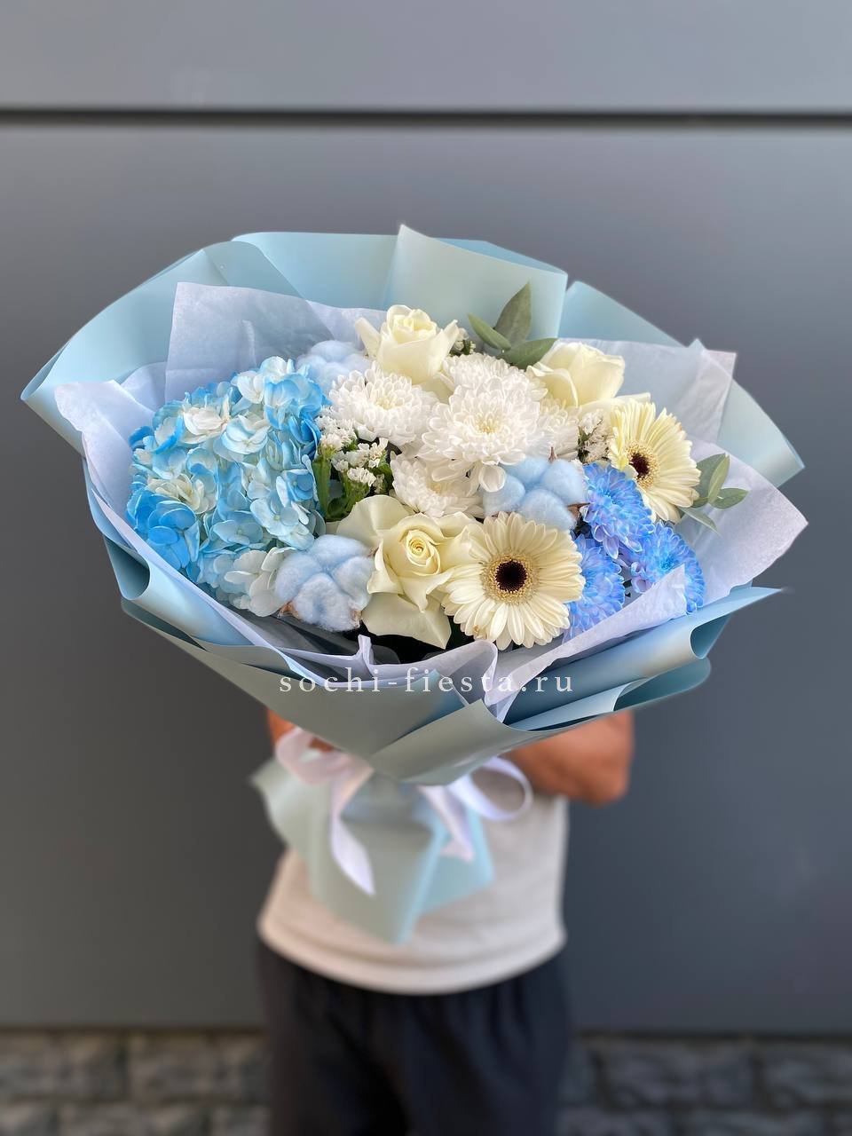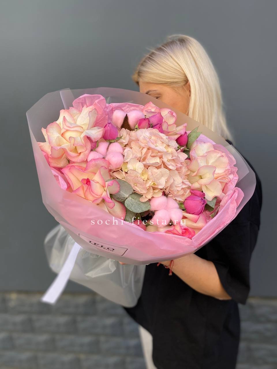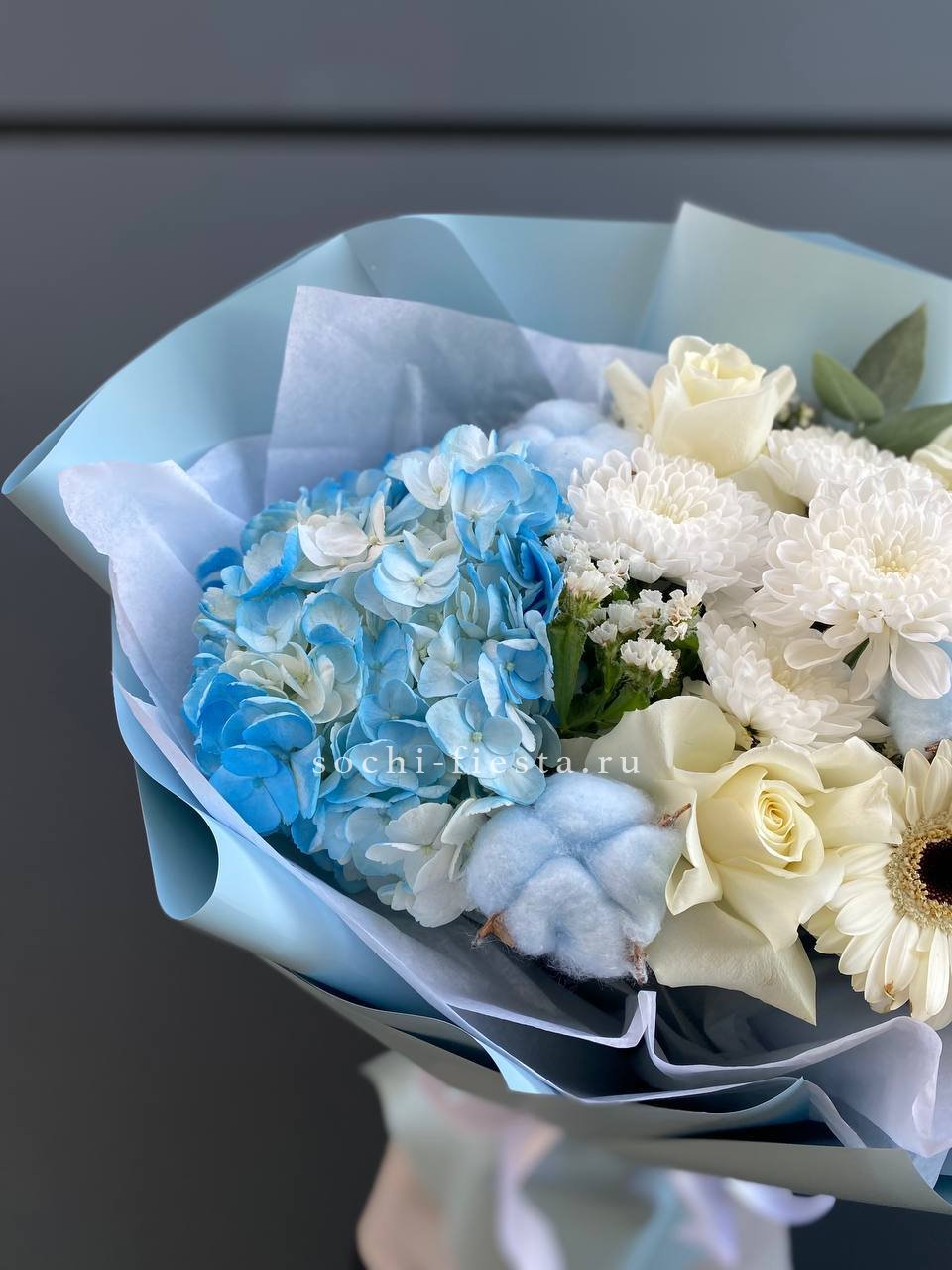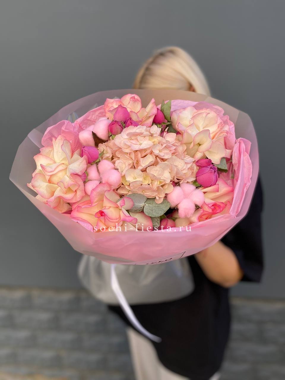 гортензия, протея, бруния, диантусы (или эустома), хризантема Бигуди, пионовидная кустовая роза, эвкалипт, листья стрелиции, помпас, дизайнерское оформление.