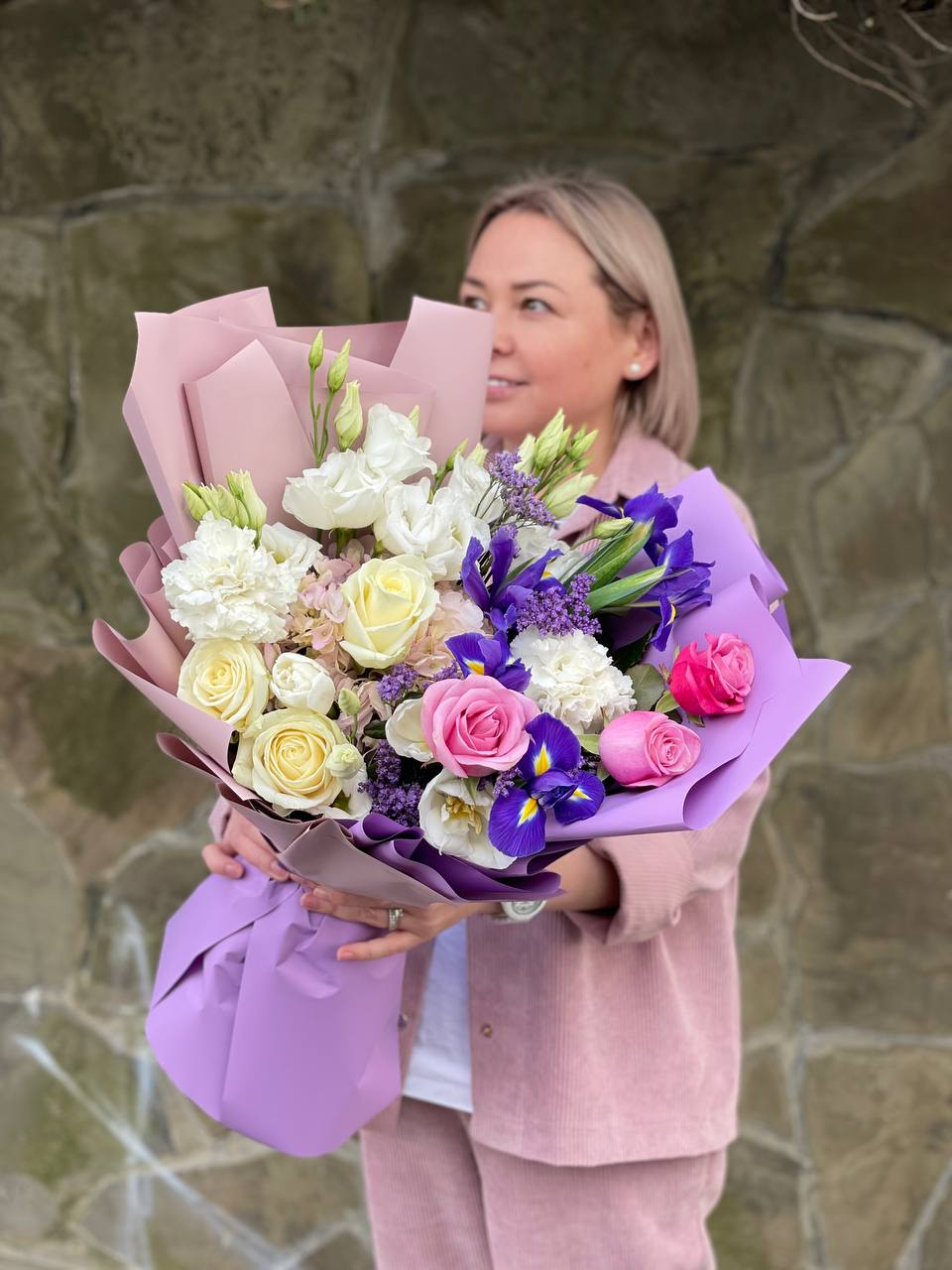 гортензия, эустома, ирис, тюльпан (или аналог), розы, лимониум (или аналог), диантус, дизайнерское оформление.