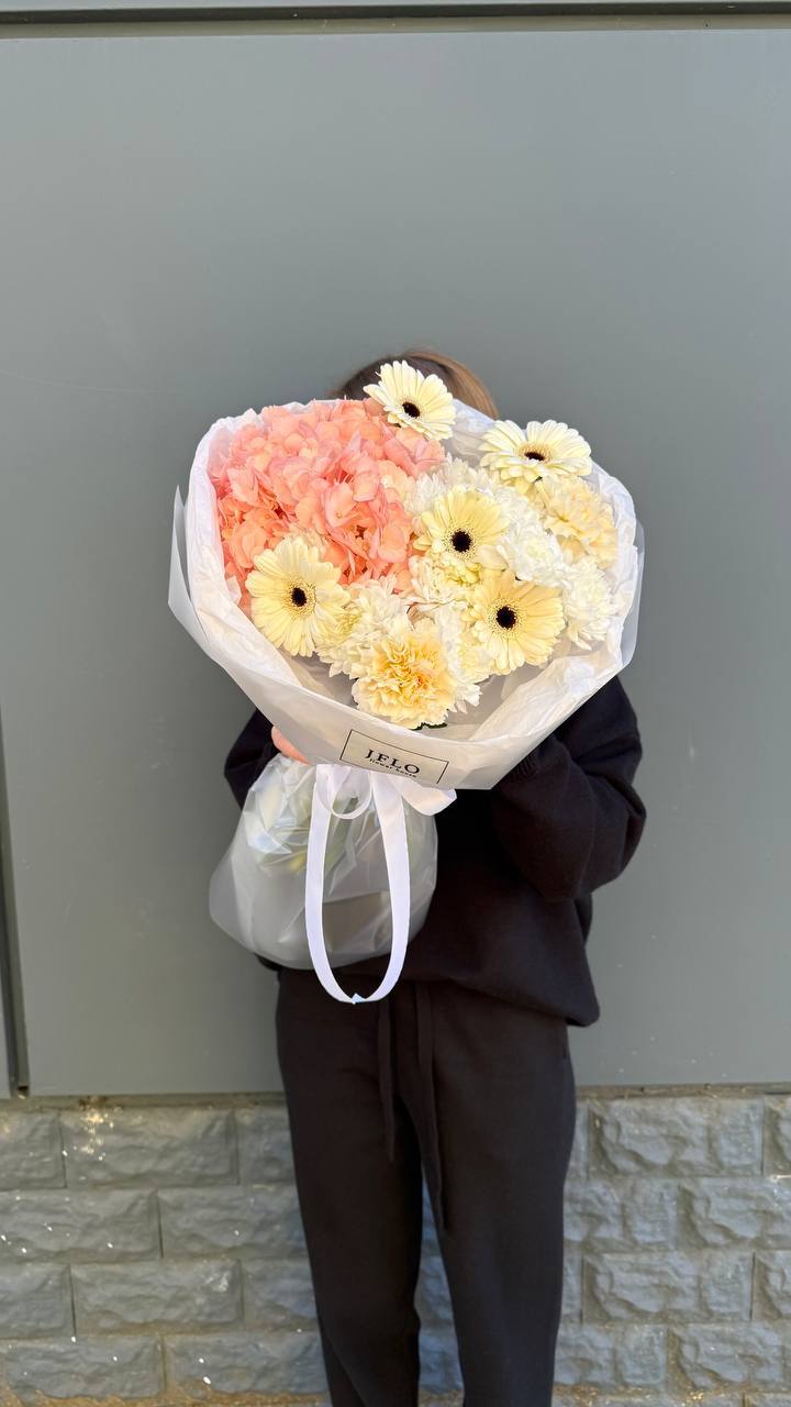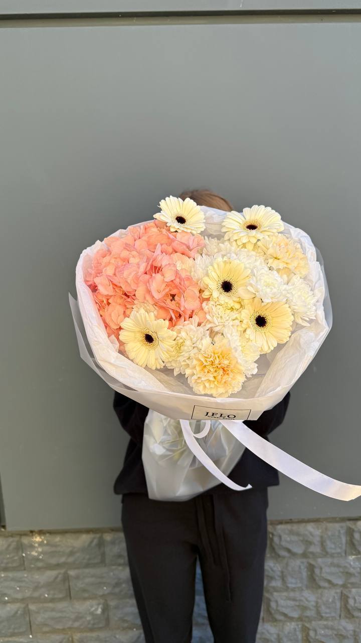 Светло-розовая палитра раскрывается от пудровых роз до свежих гербер. Бруния и аспарагус добавляют фактурные детали, а гортензия мягко завершает цветовую гамму.