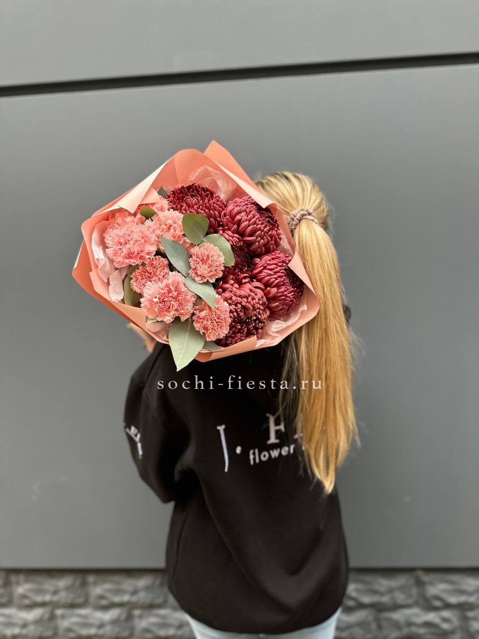Диантусы и бигуди собраны в плотную форму с чёткими линиями. Эвкалипт задаёт вертикальный ритм и добавляет свежести. Композиция выглядит графично и современно.