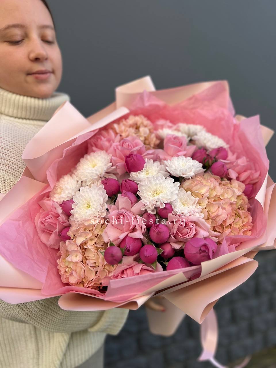 Этот пышный и по-настоящему масштабный букет — идеальный пример авторской флористики, где объем сочетается с невероятной нежностью.