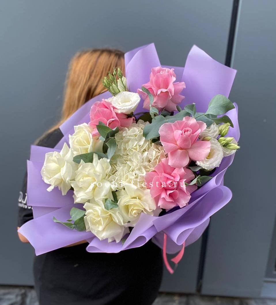 гортензия, гербера, диантус, эустома, свит ревиваль, кустовая роза, эвкалипт, лента, корейская пленка.