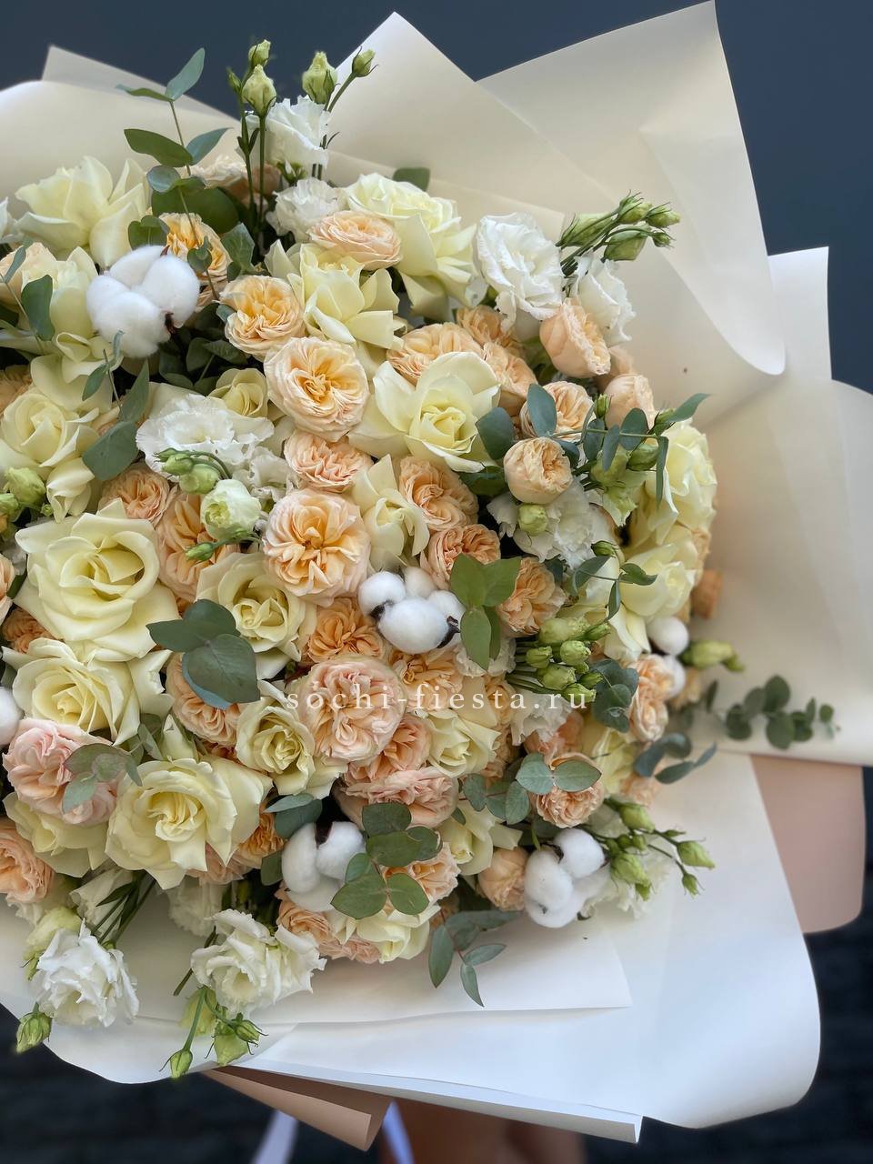 Белоснежная палитра с эустомой и пионовидными розами дополнена натуральным хлопком и эвкалиптом. Крупная композиция с выразительным присутствием и продуманной архитектурой. Форма держится долго благодаря плотности сборки.