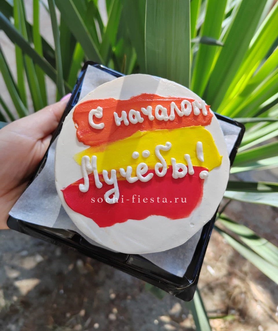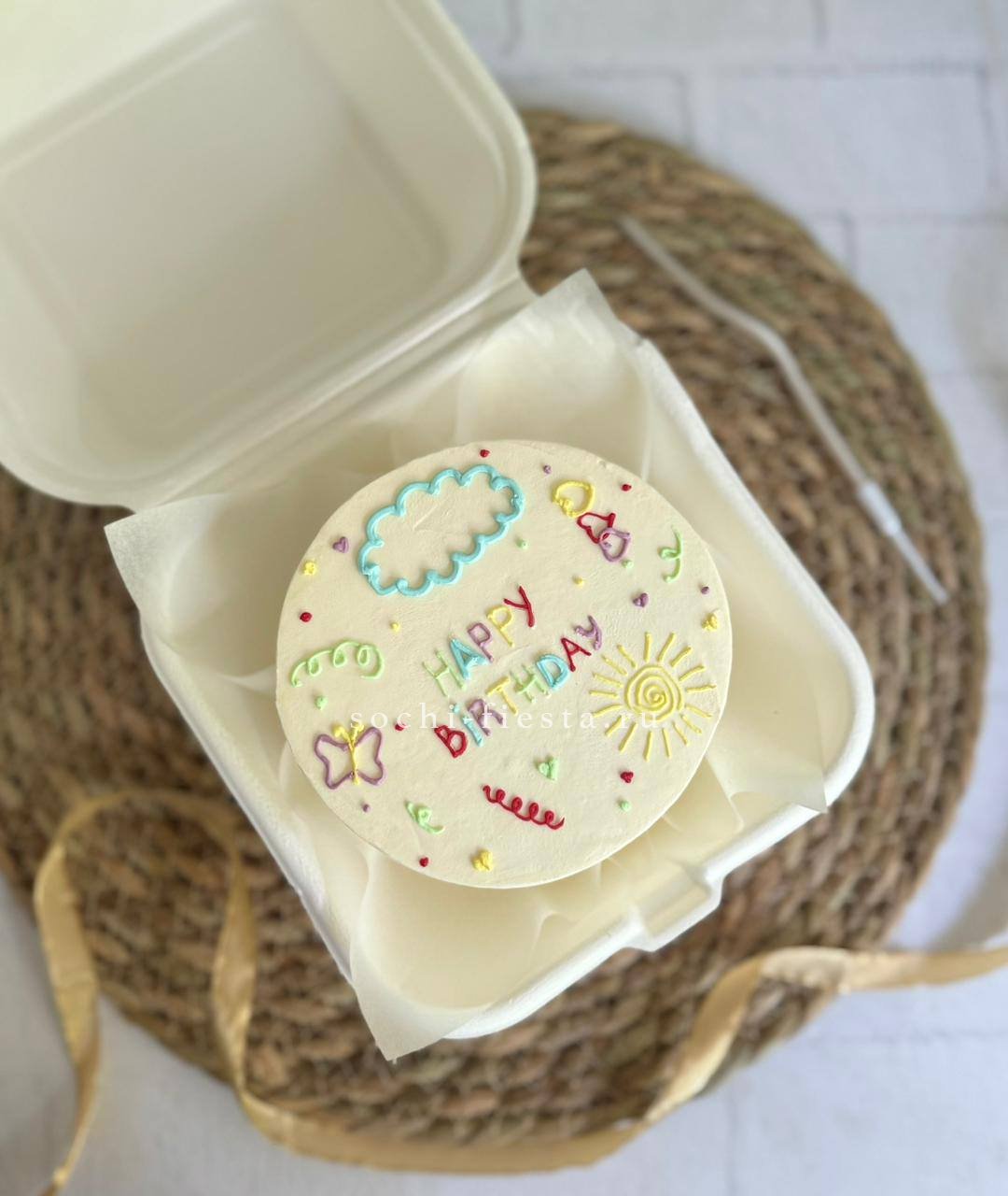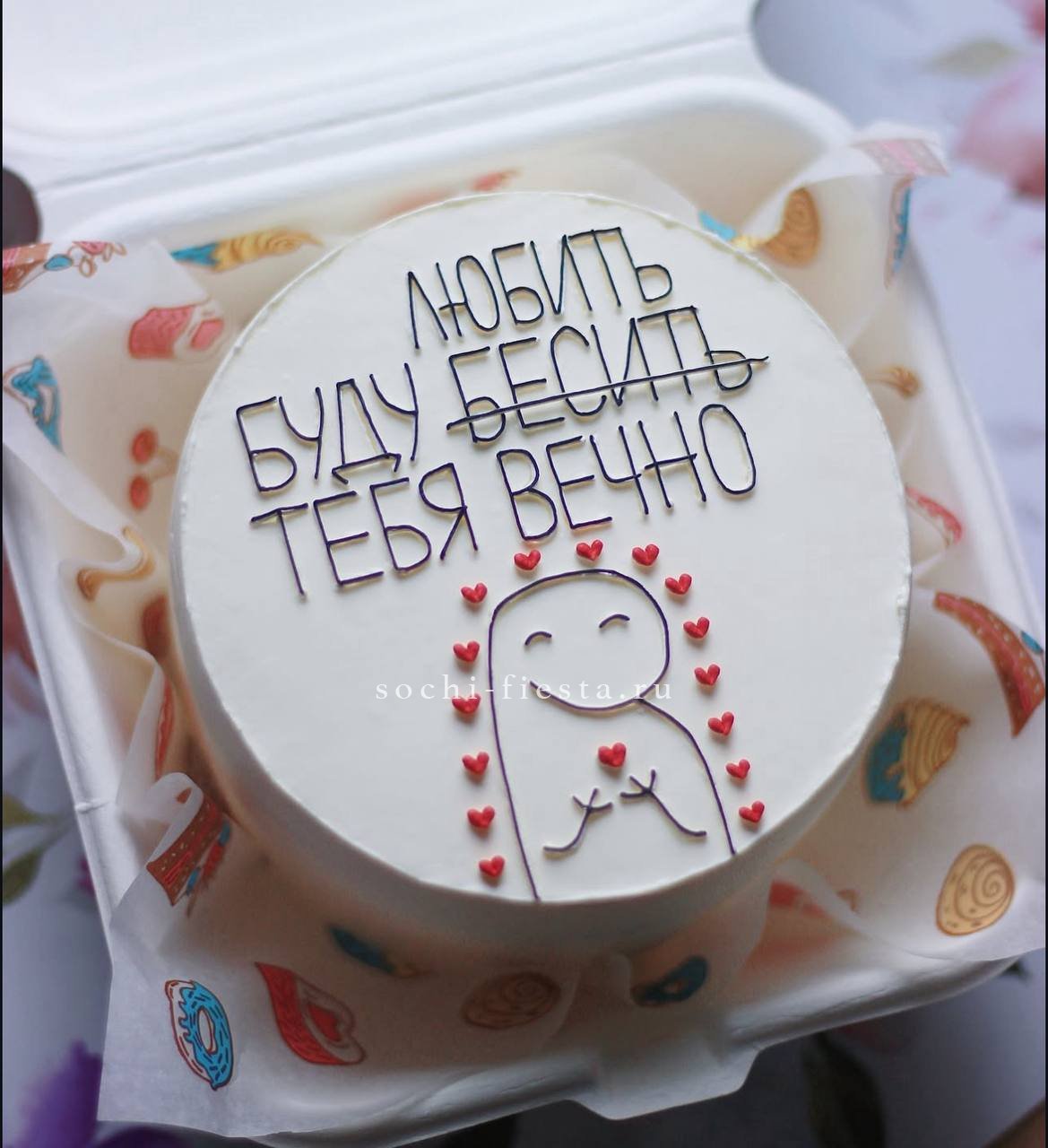 Миниатюрный торт с яркой надписью и домашним теплом в каждом слое. Крем держит форму, а бисквит остается влажным благодаря небольшому объему и свежести выпечки.